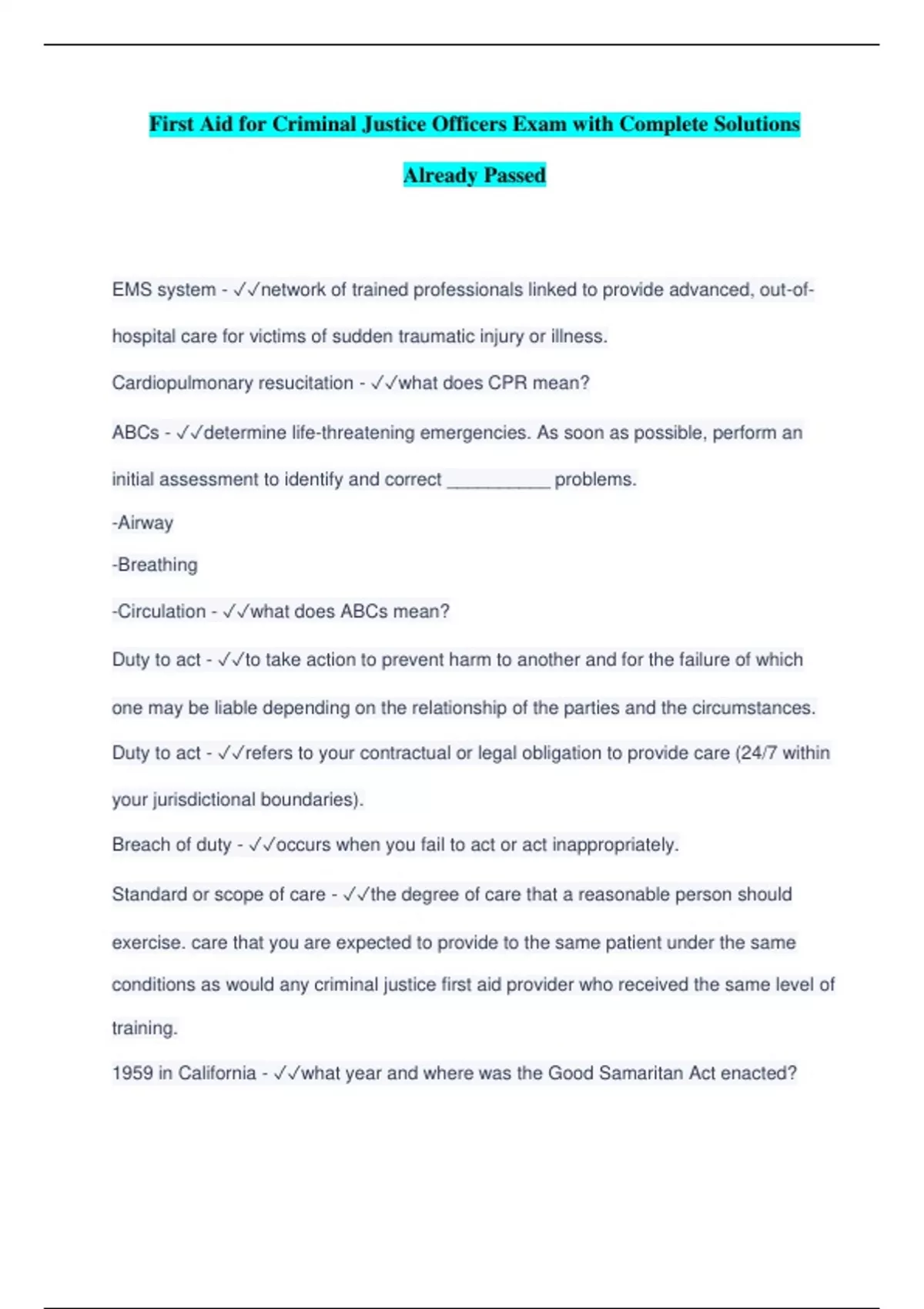 First Aid for Criminal Justice Officers Exam with Complete Solutions Already Passed