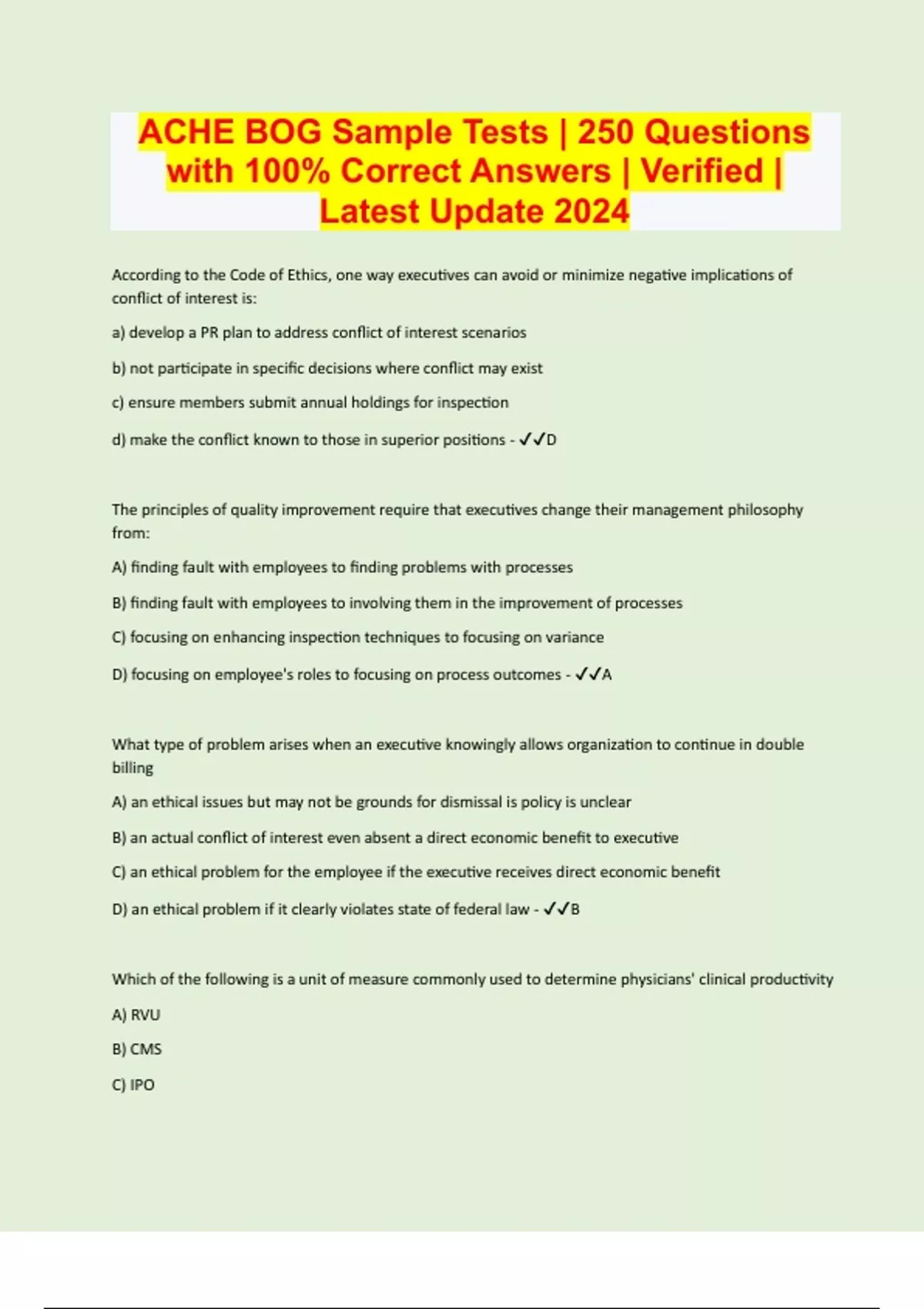 ACHE BOG Sample Tests | 250 Questions with 100% Correct Answers | Verified | Latest Update 2024