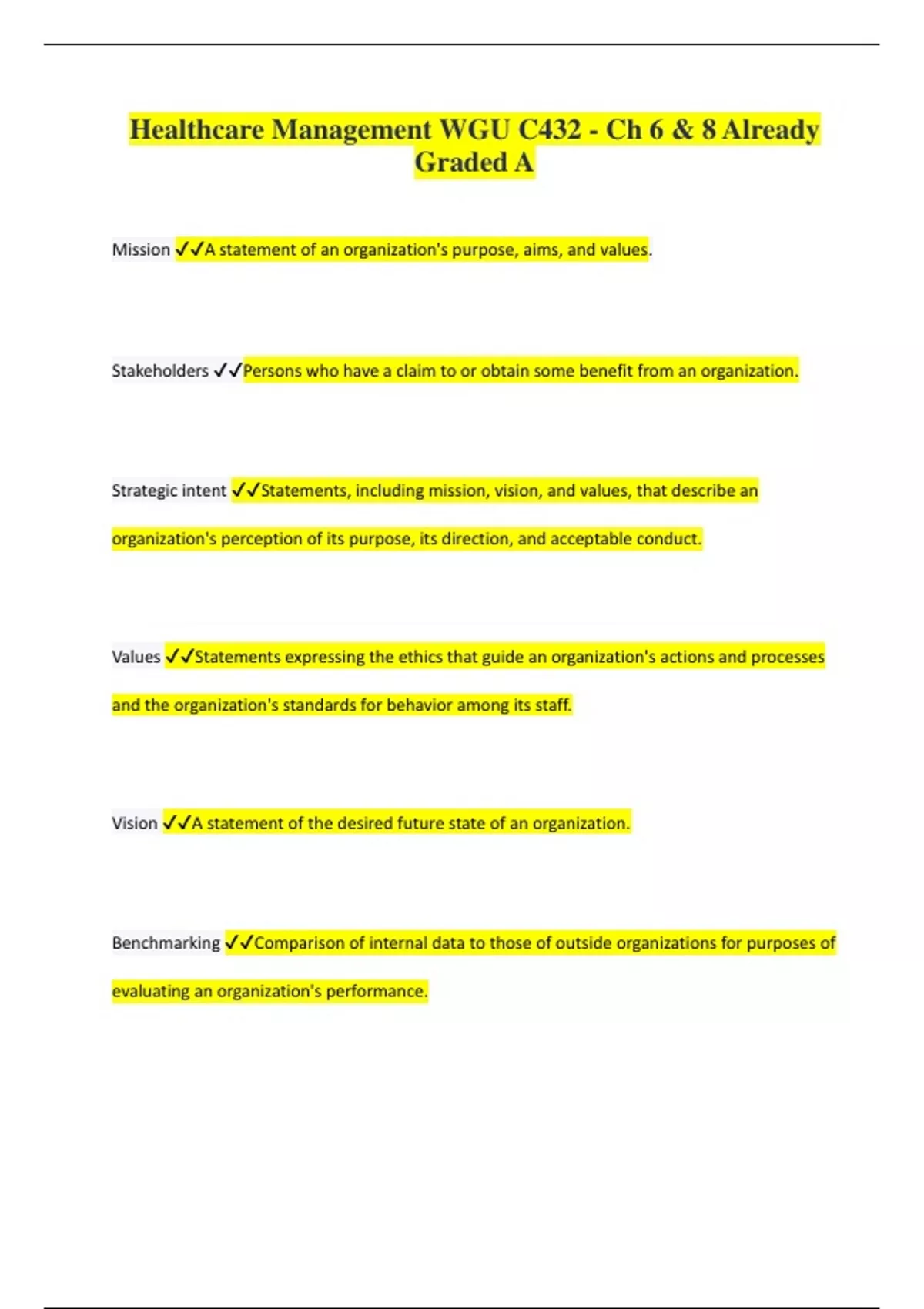 Healthcare Management WGU C432 - Ch 6 & 8 with solutions