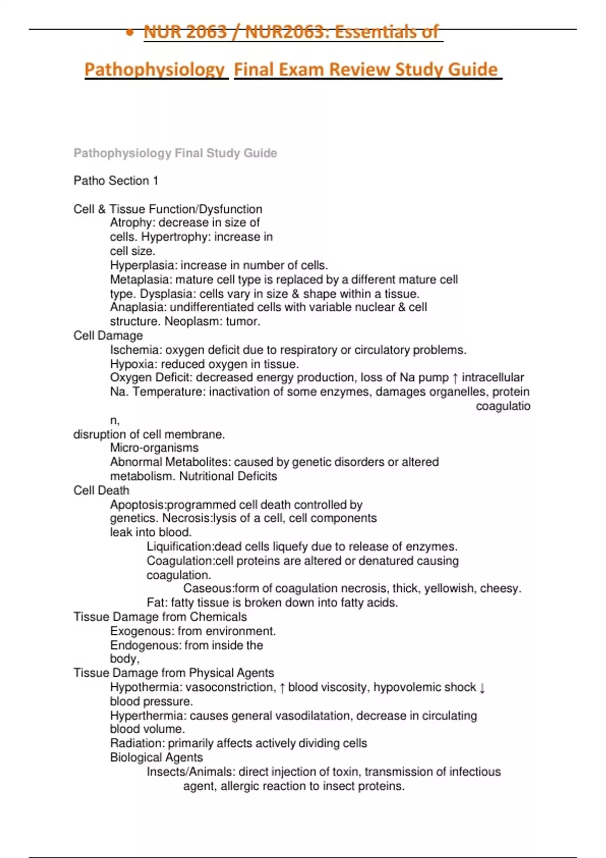 NUR 2063 / NUR2063: Essentials of Pathophysiology Final Exam Review Study Guide (Latest 2023) Rasmussen 100% Complete Pathophysiology Final Study Guide Patho Section 1 Cell & Tissue Function/Dysfunction Atrophy: decrease in size of cells. Hypertrophy: increase in cell size. Hyperplasia: increase in number of cells. Metaplasia: mature cell type is replaced by a different mature cell type. Dysplasia: cells vary in size & shape within a tissue. Anaplasia: undifferentiated cells with variable nuclear & cell structure. Neoplasm: tumor. Cell Damage Ischemia: oxygen deficit due to respiratory or circulatory problems. Hypoxia: reduced oxygen in tissue. Oxygen Deficit: decreased energy production, loss of Na pump ↑ intracellular Na. Temperature: inactivation of some enzymes, damages organelles, protein coagulatio n, disruption of cell membrane. Micro-organisms Abnormal Metabolites: caused by genetic disorders or altered metabolism. Nutritional Deficits Cell Death Apoptosis:programmed cell death controlled by genetics. Necrosis:lysis of a cell, cell components leak into blood. Liquification:dead cells liquefy due to release of enzymes. Coagulation:cell proteins are altered or denatured causing coagulation. Caseous:form of coagulation necrosis, thick, yellowish, cheesy. Fat: fatty tissue is broken down into fatty acids. Tissue Damage from Chemicals Exogenous: from environment. Endogenous: from inside the body, Tissue Damage from Physical Agents Hypothermia: vasoconstriction, ↑ blood viscosity, hypovolemic shock ↓ blood pressure. Hyperthermia: causes general vasodilatation, decrease in circulating blood volume. Radiation: primarily affects actively dividing cells Biological Agents Insects/Animals: direct injection of toxin, transmission of infectious agent, allergic reaction to insect proteins. NUR 2063 / NUR2063: Essentials of Pathophysiology Final Exam Review Study Guide (Latest 2023) Food Poisoning Rasmussen 100% Complet