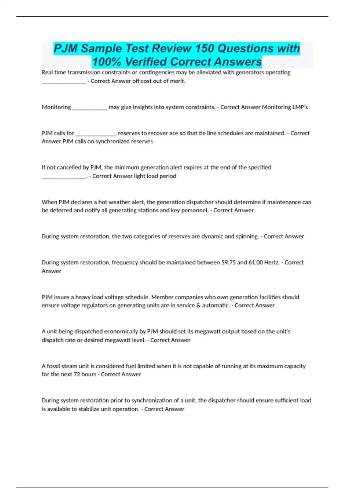 PJM Sample Test Review 150 Questions with 100% Verified Correct Answers Real time transmission constraints or contingencies may be alleviated with generators operating ______________ - Correct Answer off cost out of merit. Monitoring ___________ may give insights into system constraints. - Correct Answer Monitoring LMP's PJM calls for _____________ reserves to recover ace so that tie line schedules are maintained. - Correct Answer PJM calls on synchronized reserves If not cancelled by PJM, the minimum generation alert expires at the end of the specified ______________. - Correct Answer light load period When PJM declares a hot weather alert, the generation dispatcher should determine if maintenance can be deferred and notify all generating stations and key personnel. - Correct Answer During system restoration, the two categories of reserves are dynamic and spinning. - Correct Answer During system restoration, frequency should be maintained between 59.75 and 61.00 Hertz. - Correct Answer PJM issues a heavy load voltage schedule. Member companies who own generation facilities should ensure voltage regulators on generating units are in service & automatic. - Correct Answer A unit being dispatched economically by PJM should set its megawatt output based on the unit's dispatch rate or desired megawatt level. - Correct Answer A fossil steam unit is considered fuel limited when it is not capable of running at its maximum capacity for the next 72 hours - Correct Answer During system restoration prior to synchronization of a unit, the dispatcher should ensure sufficient load is available to stabilize unit operation. - Correct Answer