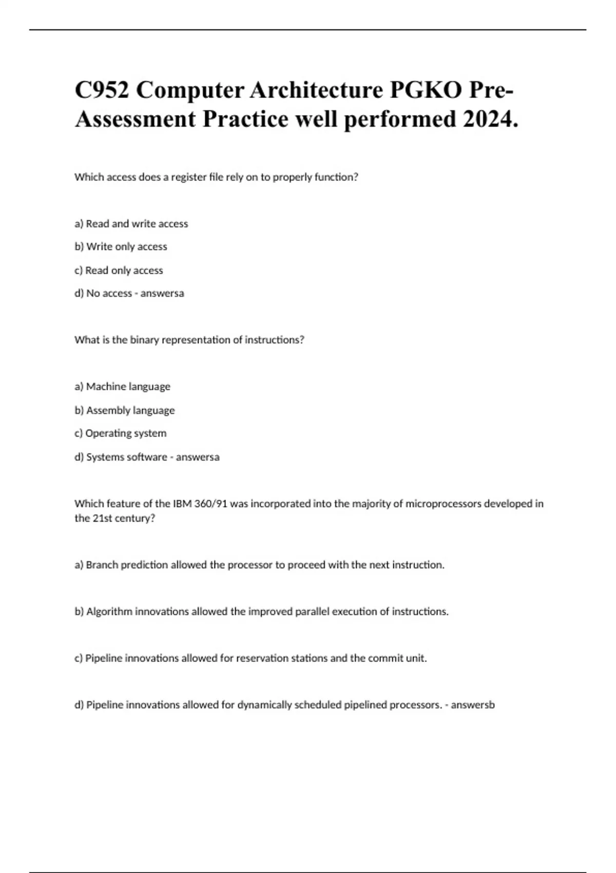 C952 Computer Architecture PGKO Pre-Assessment Practice well performed 2024.