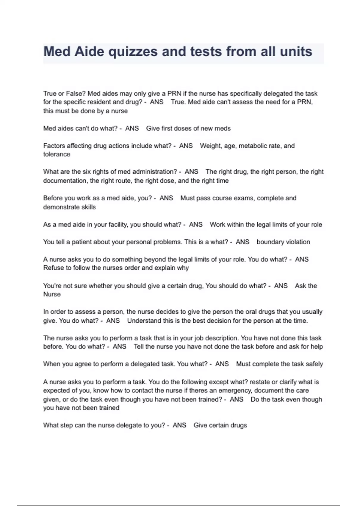 Med Aide quizzes and tests from all units Exam Questions And Answers True or False? Med aides may only give a PRN if the nurse has specifically delegated the task for the specific resident and drug? - ANS True. Med aide can't assess the need for a PRN, this must be done by a nurse Med aides can't do what? - ANS Give first doses of new meds Factors affecting drug actions include what? - ANS Weight, age, metabolic rate, and tolerance What are the six rights of med administration? - ANS The right drug, the right person, the right documentation, the right route, the right dose, and the right time Before you work as a med aide, you? - ANS Must pass course exams, complete and demonstrate skills As a med aide in your facility, you should what? - ANS Work within the legal limits of your role You tell a patient about your personal problems. This is a what? - ANS boundary violation A nurse asks you to do something beyond the legal limits of your role. You do what? - ANS Refuse to follow the nurses order and explain why You're not sure whether you should give a certain drug, You should do what? - ANS Ask the Nurse In order to assess a person, the nurse decides to give the person the oral drugs that you usually give. You do what? - ANS Understand this is the best decision for the person at the time. The nurse asks you to perform a task that is in your job description. You have not done this task before. You do what? - ANS Tell the nurse you have not done the task before and ask for help When you agree to perform a delegated task. You what? - ANS Must complete the task safely A nurse asks you to perform a task. You do the following except what? restate or clarify what is expected of you, know how to contact the nurse if theres an emergency, document the care given, or do the task even though you have not been trained? - ANS Do the task even though you have not been trained What step can the nurse delegate to you? - ANS Give certain drugs The Food and Drug Administration (FDA) has the power to do the following except what? Determine the safety and effectiveness of drugs before marketing, ensure that manufacturers meet labeling requirements, ensure advertising standards are met when manufacturers market drugs, or determine who gives drugs to patients or residents? - ANS Determine who gives drugs to patients or residents If you fail to do something that a reasonable and careful person would have done, you are what? - ANS Negligent Invasion of privacy occurs if you what? - ANS Violate a persons right to have his or her name, photo, or private affairs made public without giving consent You suspect a persons being abused. You should what? - ANS Share your concerns with your supervisor Schedule 11 drugs may lead to what? - ANS Severe psychological or physical dependence According to the text, when you touch a persons body without his or her consent its called a what? - ANS Battery The intentional mistreatment or harm of another person is what? - ANS Abuse Knowledge of what is right conduct and wrong conduct is called what? - ANS Ethics Which statement about an ethical person is true? - ANS An ethical person behaves in the right way You display ethical behavior by what? - ANS Keeping the persons property safe To protect yourself from assault and battery, you what? - ANS Get the persons consent before doing a procedure A nurse gives the wrong dosage of a drug to a person. This is what? - ANS malpractice You gave a drug to the wrong person. This is what? - ANS Negligence You trick a person into taking a drug. This is called what? - ANS Fraud You scold an older person for refusing to take ordered drugs This is what? - ANS Verbal abuse Violating or failing to comply with the Controlled Substance Act can result in a what? - ANS Fine and Prison term