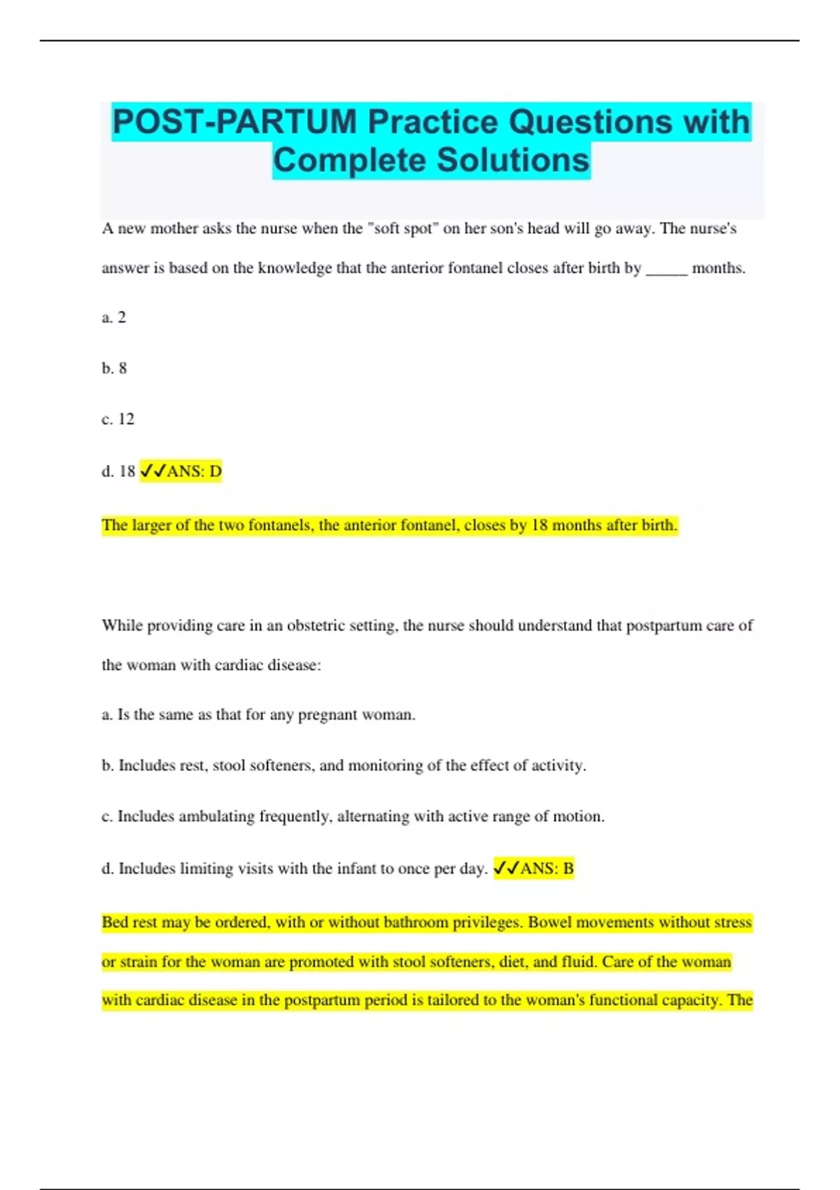 POST-PARTUM Practice Questions with Complete Solutions A new mother asks the nurse when the "soft spot" on her son's head will go away. The nurse's answer is based on the knowledge that the anterior fontanel closes after birth by _____ months. a. 2 b. 8 c. 12 d. 18 ANS: D The larger of the two fontanels, the anterior fontanel, closes by 18 months after birth. While providing care in an obstetric setting, the nurse should understand that postpartum care of the woman with cardiac disease: a. Is the same as that for any pregnant woman. b. Includes rest, stool softeners, and monitoring of the effect of activity. c. Includes ambulating frequently, alternating with active range of motion. d. Includes limiting visits with the infant to once per day. ANS: B Bed rest may be ordered, with or without bathroom privileges. Bowel movements without stress or strain for the woman are promoted with stool softeners, diet, and fluid. Care of the woman with cardiac disease in the postpartum period is tailored to the woman's functional capacity. The woman will be on bed rest to conserve energy and reduce the strain on the heart. Although the woman may need help caring for the infant, breastfeeding and infant visits are not contraindicated. A woman with asthma is experiencing a postpartum hemorrhage. Which drug would NOT be used to treat her bleeding because it may exacerbate her asthma? a. Pitocin b. Nonsteroidal antiinflammatory drugs (NSAIDs) c. Hemabate d. Fentanyl ANS: C Prostaglandin derivatives should not be used to treat women with asthma, because they may exacerbate symptoms. Pitocin would be the drug of choice to treat this woman's bleeding because it would not exacerbate her asthma. NSAIDs are not used to treat bleeding. Fentanyl is used to treat pain, not bleeding. In caring for an immediate postpartum client, you note petechiae and oozing from her IV site. You would monitor her closely for the clotting disorder: a. Disseminated intravascular coagulation (DIC) b. Amniotic fluid embolism (AFE) c. Hemorrhage d. HELLP syndrome ANS: A The diagnosis of DIC is made according to clinical findings and laboratory markers. Physical examination reveals unusual bleeding. Petechiae may appear around a blood pressure cuff on the woman's arm. Excessive bleeding may occur from the site of a slight trauma such as venipuncture sites. These symptoms are not associated with AFE, nor is AFE a bleeding disorder. Hemorrhage occurs for a variety of reasons in the postpartum client. These symptoms are associated with DIC. Hemorrhage would be a finding associated with DIC and is not a clotting disorder in and of itself. HELLP is not a clotting disorder, but it may contribute to the clotting disorder DIC. Your client has been on magnesium sulfate for 20 hours for treatment of preeclampsia. She just delivered a viable infant girl 30 minutes ago. What uterine findings would you expect to observe/assess in this client? a. Absence of uterine bleeding in the postpartum period b. A fundus firm below the level of the umbilicus c. Scant lochia flow d. A boggy uterus with heavy lochia flow ANS: D Because of the tocolytic effects of magnesium sulfate, this client most likely would have a boggy uterus with increased amounts of bleeding and a heavy lochia flow in the postpartum period