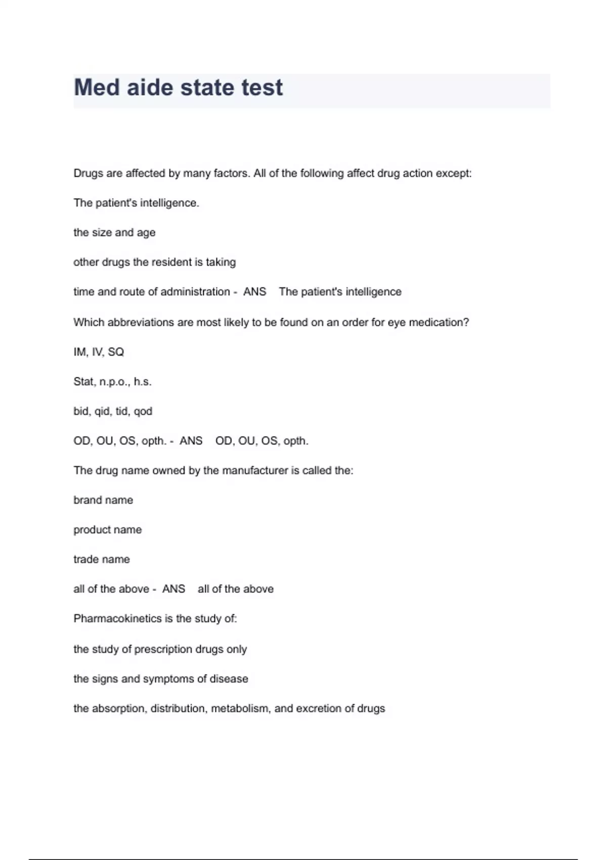 Med aide state test Questions And Answers Drugs are affected by many factors. All of the following affect drug action except: The patient's intelligence. the size and age other drugs the resident is taking time and route of administration - ANS The patient's intelligence Which abbreviations are most likely to be found on an order for eye medication? IM, IV, SQ Stat, n.p.o., h.s. bid, qid, tid, qod OD, OU, OS, opth. - ANS OD, OU, OS, opth. The drug name owned by the manufacturer is called the: brand name product name trade name all of the above - ANS all of the above Pharmacokinetics is the study of: the study of prescription drugs only the signs and symptoms of disease the absorption, distribution, metabolism, and excretion of drugs none of the above - ANS the absorption, distribution, metabolism, and excretion of drugs Examples of drugs made from animal sources are: insulin and heparin furosemide and castor oil magnesium hydrochloride and iodine iron and calcium - ANS insulin and heparin A patient may take two drugs for hypertension because of their: antagonistic affect potentiation synergistic effect idiosyncratic response - ANS synergistic effect Parmacodynamics is the study of: drug sources the medical field the diseases of the body the interactions between drugs and the body - ANS the interactions between drugs and the body The following abbreviations are correct except b.i.d. means 2 times daily n.p.o. means nothing by mouth stat means now q.i.d. means every other day - ANS q.i.d. means every other day Rules that ensure uniform strength, quality, and purity of drugs are called: drug standards drug references drug laws drug specifications - ANS Drug standards Biotransformation is: A. a series of chemical reactions that occur naturally B. the removal of waste products C. the same as metabolism a. and c. - ANS a. and c. Examples of drugs made from plant sources are: iron and salt heparin and insulin digitalis and opium sulfa drugs and hydroxyurea - ANS digitalis and opium The generic name is usually the same as the: brand name chemical name official name trade name - ANS official name The action of a drug is: a desireable effect that occurs apart from the primary purpose of giving the drug the chemical effect on body cells
