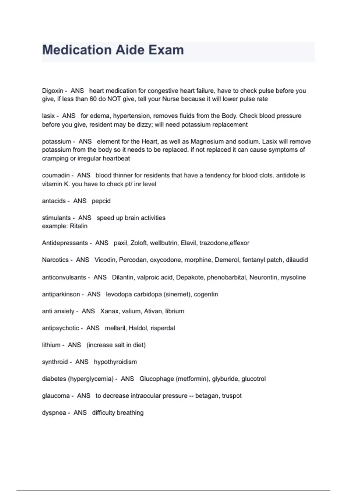 Medication Aide Exam Questions And Answers Digoxin - ANS heart medication for congestive heart failure, have to check pulse before you give, if less than 60 do NOT give, tell your Nurse because it will lower pulse rate lasix - ANS for edema, hypertension, removes fluids from the Body. Check blood pressure before you give, resident may be dizzy; will need potassium replacement potassium - ANS element for the Heart, as well as Magnesium and sodium. Lasix will remove potassium from the body so it needs to be replaced. if not replaced it can cause symptoms of cramping or irregular heartbeat coumadin - ANS blood thinner for residents that have a tendency for blood clots. antidote is vitamin K. you have to check pt/ inr level antacids - ANS pepcid stimulants - ANS speed up brain activities example: Ritalin Antidepressants - ANS paxil, Zoloft, wellbutrin, Elavil, trazodone,effexor Narcotics - ANS Vicodin, Percodan, oxycodone, morphine, Demerol, fentanyl patch, dilaudid anticonvulsants - ANS Dilantin, valproic acid, Depakote, phenobarbital, Neurontin, mysoline antiparkinson - ANS levodopa carbidopa (sinemet), cogentin anti anxiety - ANS Xanax, valium, Ativan, librium antipsychotic - ANS mellaril, Haldol, risperdal lithium - ANS (increase salt in diet) synthroid - ANS hypothyroidism diabetes (hyperglycemia) - ANS Glucophage (metformin), glyburide, glucotrol glaucoma - ANS to decrease intraocular pressure -- betagan, truspot dyspnea - ANS difficulty breathing diuretics - ANS medication used for edema or to remove fluids hypoxia - ANS lack of oxygen tachycardia - ANS high pulse bradycardia - ANS low pulse amnesia - ANS temporary memory loss aphasia - ANS not talking/ mute agnosia - ANS inability to recognize objects or persons apraxia - ANS inability to carry out learned movement akinesia - ANS inability to initiate movements dystonia - ANS repetitive movements akathisia - ANS unable to sit still apraxia - ANS inability to comprehend language tardive dyskinesia - ANS involuntary repetitive movements hypotension - ANS low blood pressure psychosis - ANS loss of contact with reality, have false ideas
