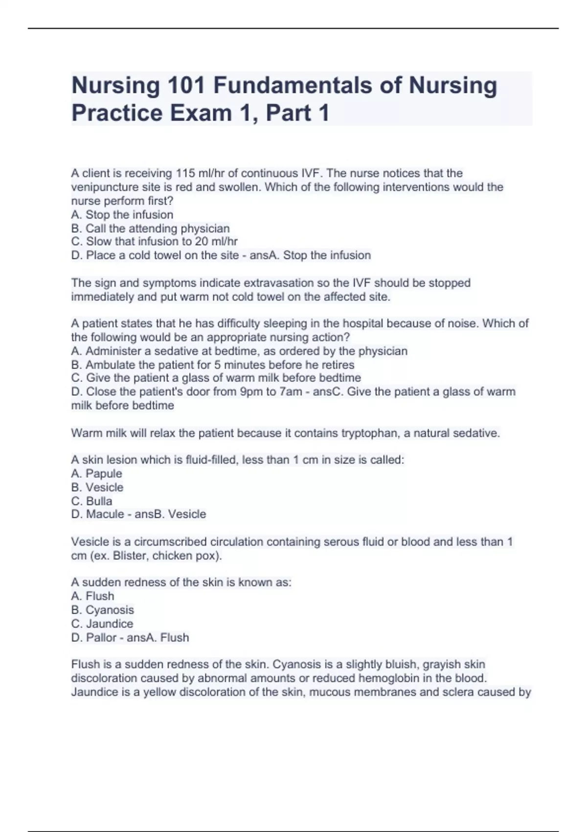 Nursing 101 Fundamentals of Nursing Practice Exam 1.