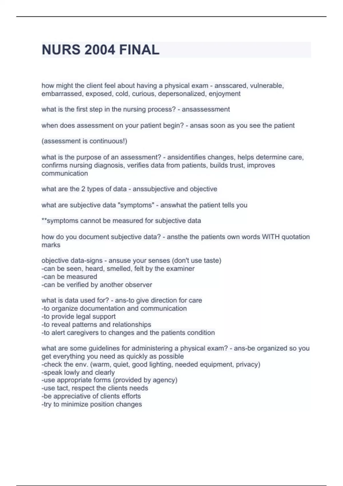 Exam of 108 pages for the course Nursing assessment at Nursing assessment (NURS 2004 FINAL.)