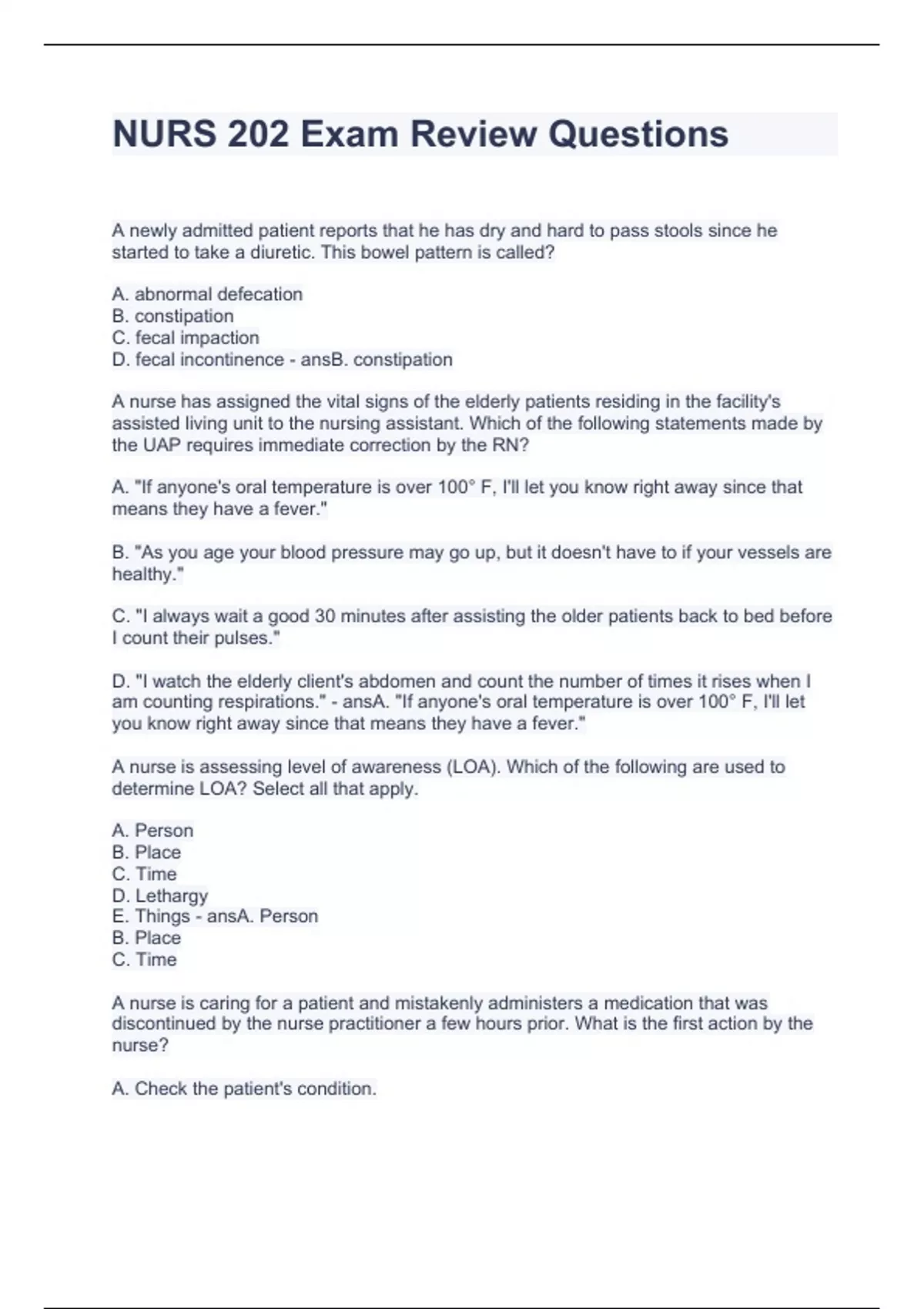 NURS 202 Exam Review Questions.