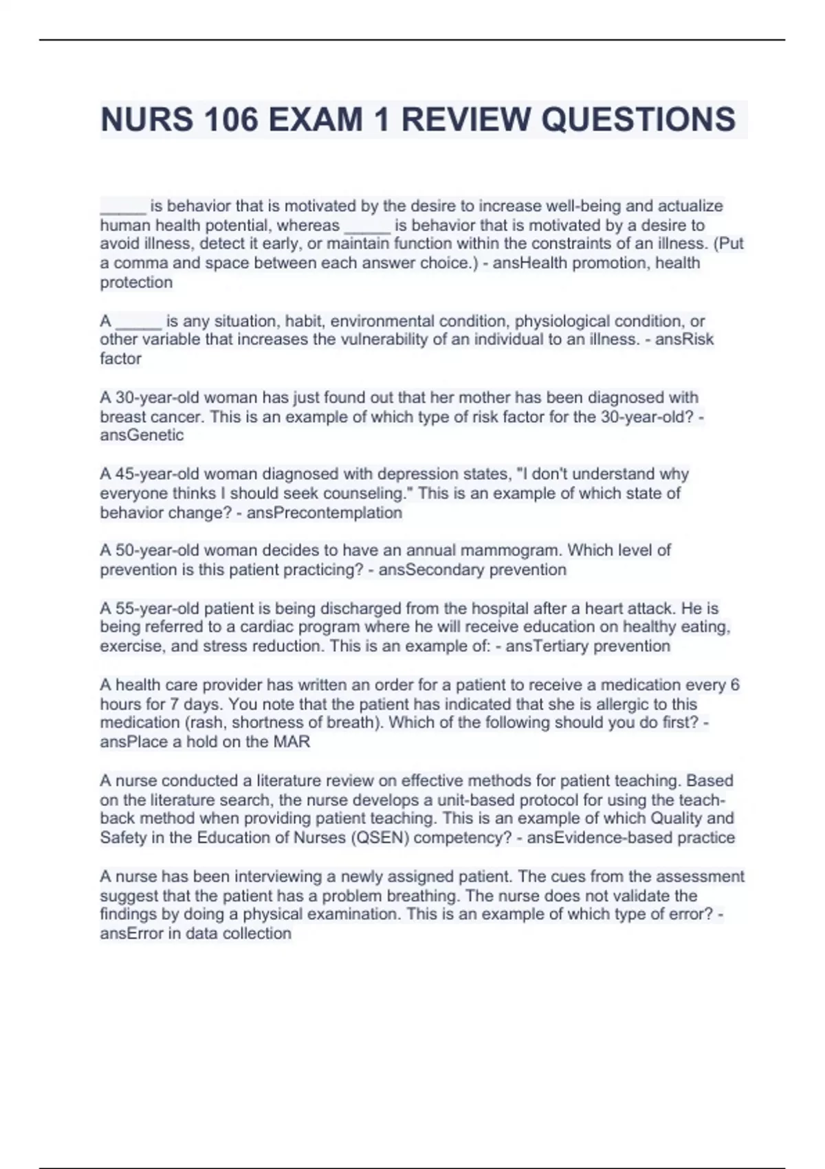 NURS 106 EXAM 1 REVIEW QUESTIONS