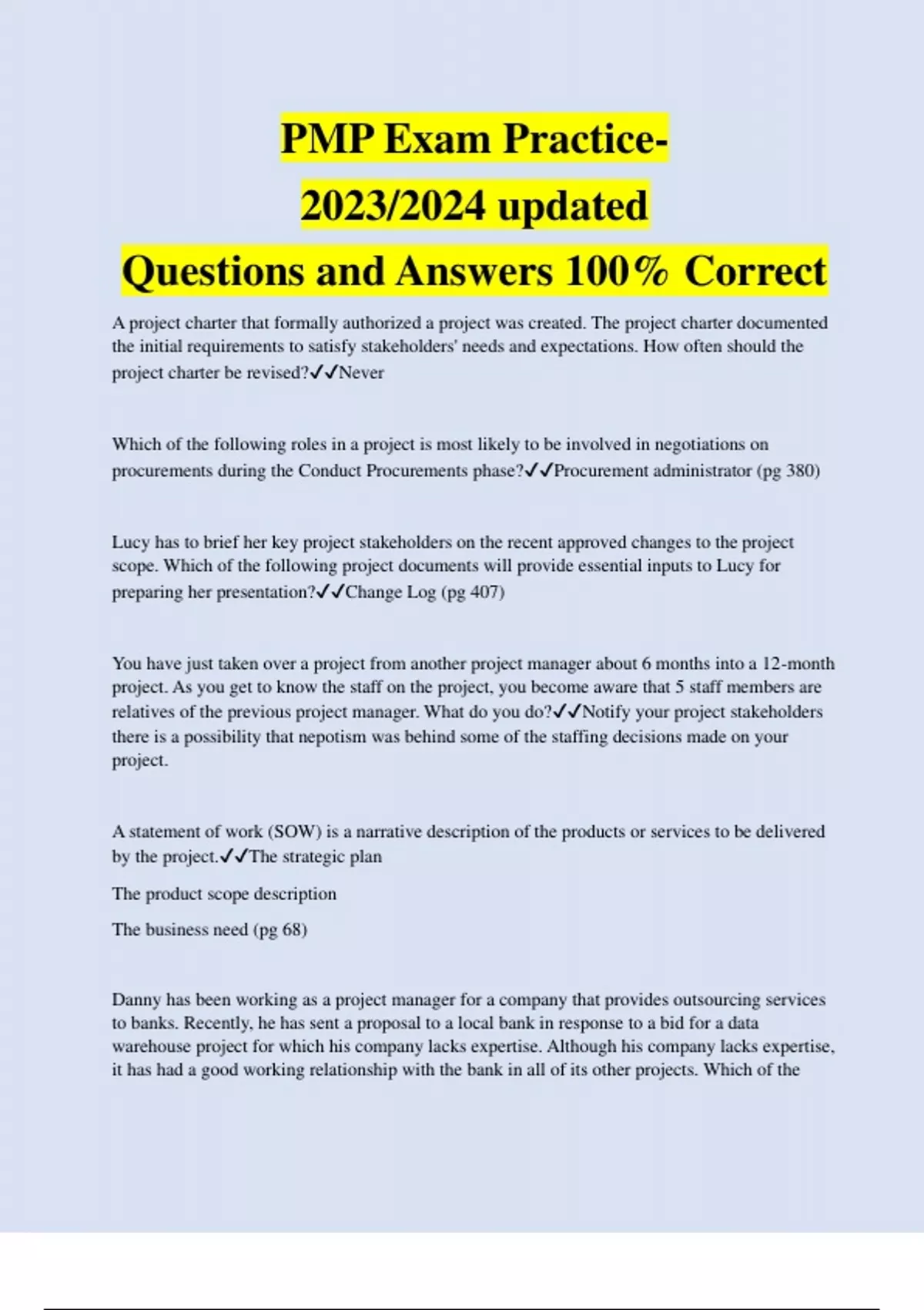 A project charter that formally authorized a project was created. The project charter documented the initial requirements to satisfy stakeholders' needs and expectations. How often should the project charter be revised?Never Which of the following roles in a project is most likely to be involved in negotiations on procurements during the Conduct Procurements phase?Procurement administrator (pg 380) Lucy has to brief her key project stakeholders on the recent approved changes to the project scope. Which of the following project documents will provide essential inputs to Lucy for preparing her presentation?Change Log (pg 407) You have just taken over a project from another project manager about 6 months into a 12-month project. As you get to know the staff on the project, you become aware that 5 staff members are relatives of the previous project manager. What do you do?Notify your project stakeholders there is a possibility that nepotism was behind some of the staffing decisions made on your project. A statement of work (SOW) is a narrative