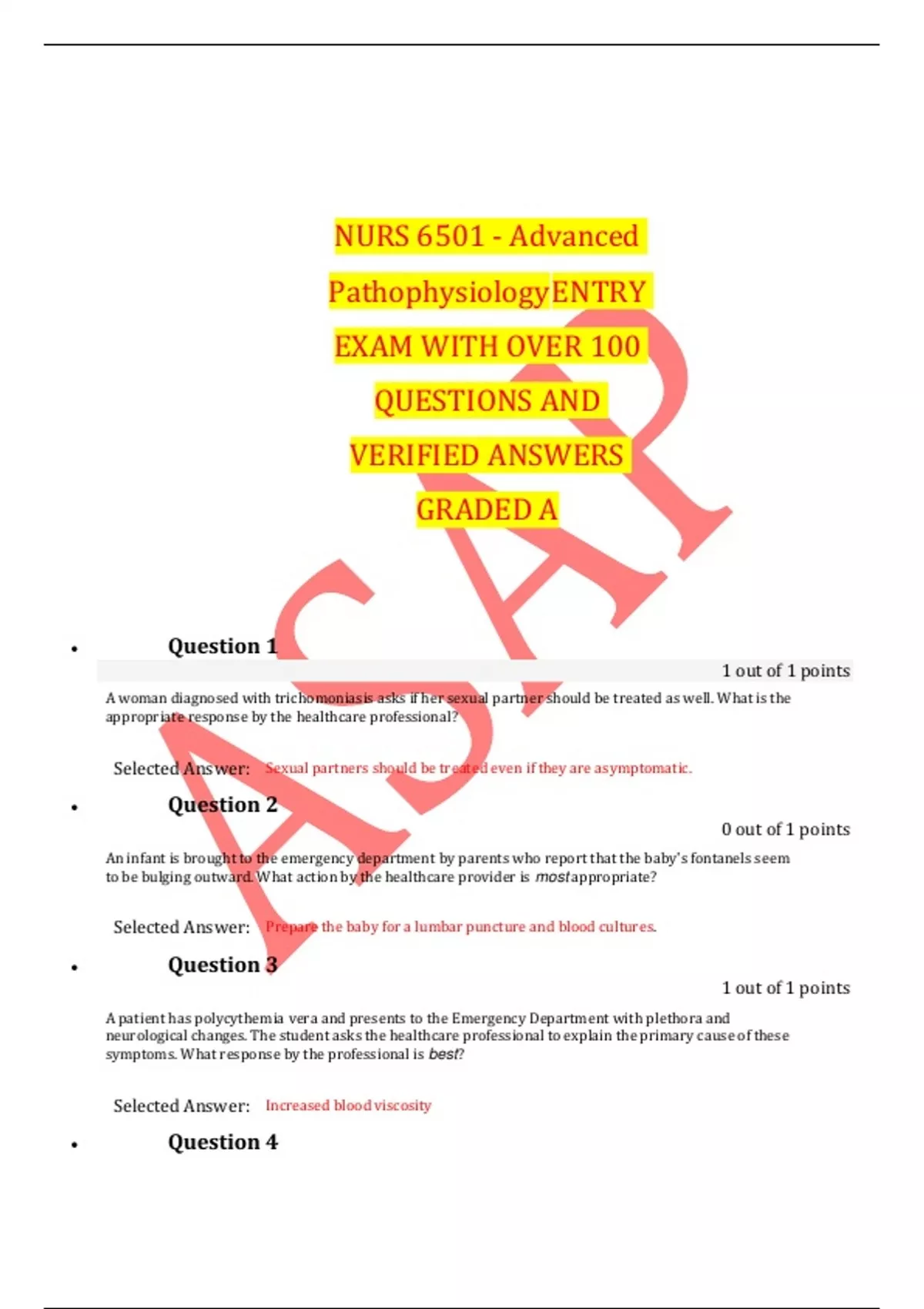 NURS 6501 - Advanced PathophysiologyENTRY EXAM WITH OVER 100 QUESTIONS AND VERIFIED ANSWERS GRADED A