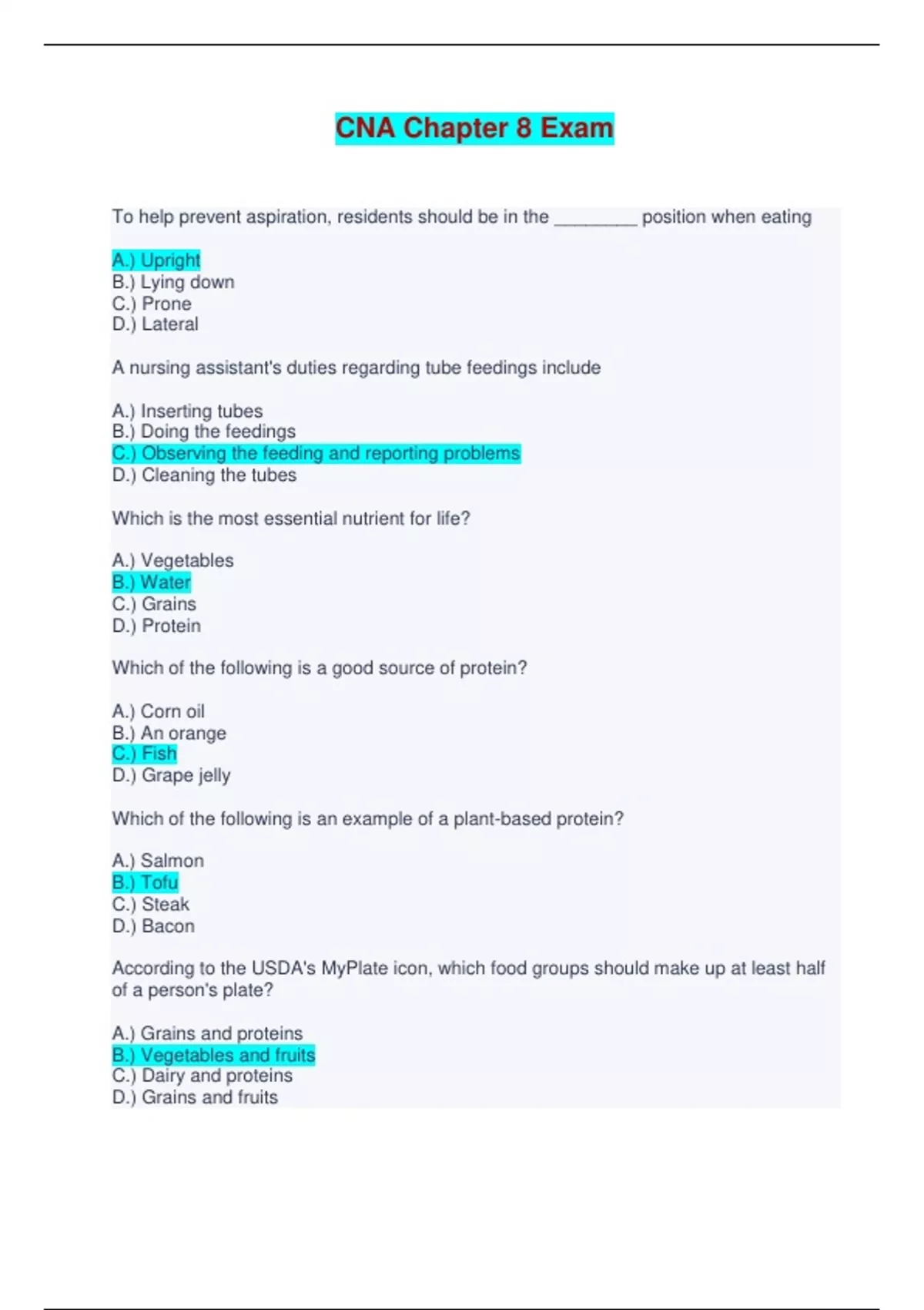 Certified Nursing Assistant | CNA Chapter 8 Exam - Questions and Answers To help prevent aspiration, residents should be in the ________ position when eating A.) Upright B.) Lying down C.) Prone D.) Lateral A nursing assistant's duties regarding tube feedings include A.) Inserting tubes B.) Doing the feedings C.) Observing the feeding and reporting problems D.) Cleaning the tubes Which is the most essential nutrient for life? A.) Vegetables B.) Water C.) Grains D.) Protein Which of the following is a good source of protein? A.) Corn oil B.) An orange C.) Fish D.) Grape jelly Which of the following is an example of a plant-based protein? A.) Salmon B.) Tofu C.) Steak D.) Bacon According to the USDA's MyPlate icon, which food groups should make up at least half of a person's plate? A.) Grains and proteins B.) Vegetables and fruits C.) Dairy and proteins D.) Grains and fruits According to MyPlate, what percentage of milk fat should a person's dairy choices contain? A.) 0% or 1% B.) 2% C.) 3% D.) 4% Which of the following is true about food preferences? A.) Residents are old enough that their preferences will not change B.) It is not important to honor residents' food preferences C.) Education is never a factor in determining food preference D.) Religion might influence food preference Which of the following is an effective way for an NA to help prevent dehydration? A.) The NA should encourage a resident to drink every time she sees him B.) The NA should insist that the resident drink juice because it is healthy C.) The NA should withhold fluids if a resident is incontinent D.) The NA should leave a carton of milk with the resident each time she leaves the room What does the abbreviation NPO mean? A.) Nothing pureed only B.) Not prepared on-site C.) Nothing by mouth D.) Note preferences only Which of the following are signs on unintended weight loss that should be reported?