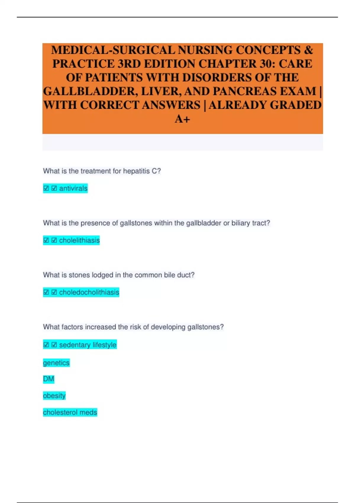 MEDICAL-SURGICAL NURSING CONCEPTS & PRACTICE 3RD EDITION CHAPTER 30: CARE OF PATIENTS WITH DISORDERS OF THE GALLBLADDER, LIVER, AND PANCREAS EXAM | WITH CORRECT ANSWERS | ALREADY GRADED A+