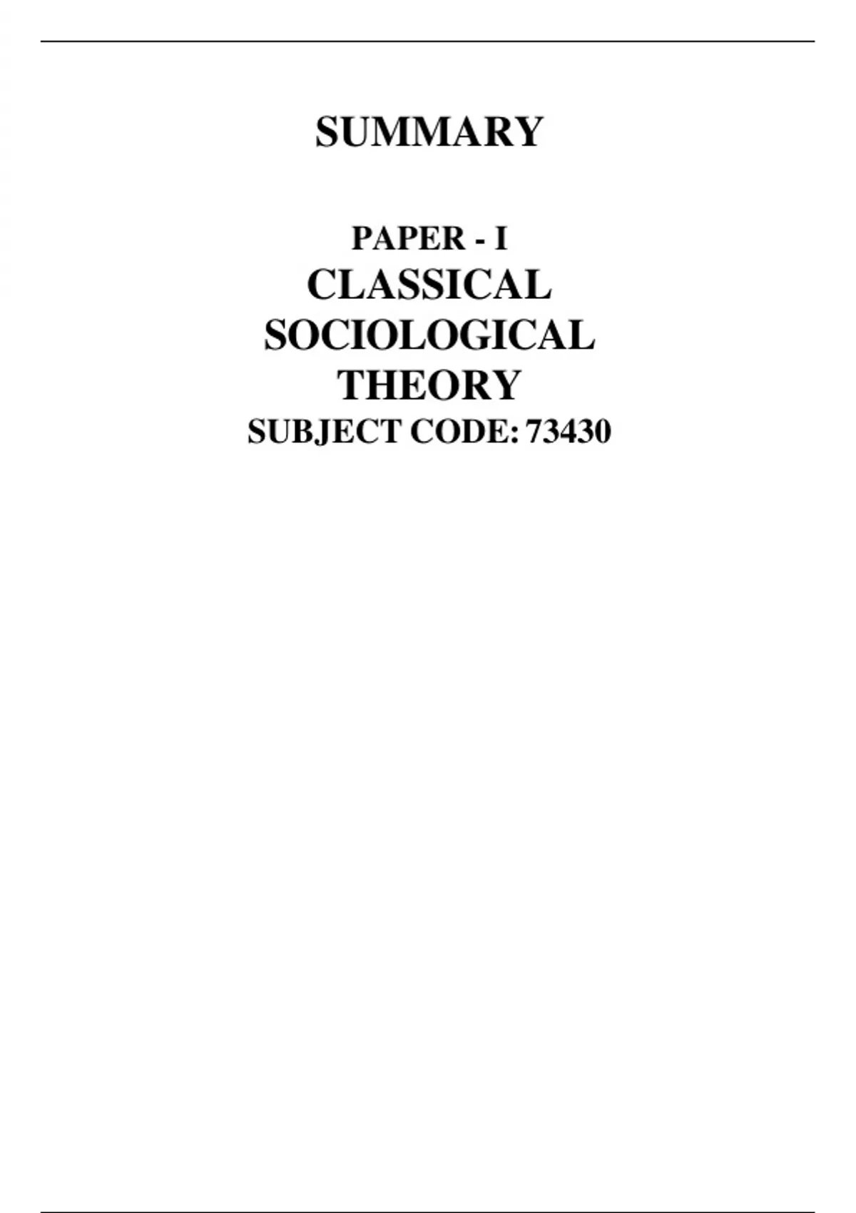 SUMMARY PAPER - I CLASSICAL SOCIOLOGICAL THEORY SUBJECT CODE: 73430