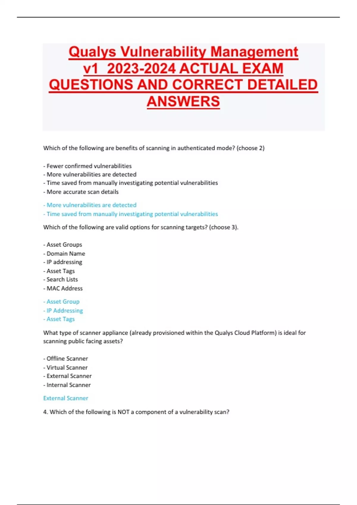 Qualys Vulnerability Management v ACTUAL EXAM QUESTIONS AND CORRECT DETAILED ANSWERS Which of the following are benefits of scanning in authenticated mode? (choose 2) - Fewer confirmed vulnerabilities - More vulnerabilities are detected - Time saved from manually investigating potential vulnerabilities - More accurate scan details - More vulnerabilities are detected - Time saved from manually investigating potential vulnerabilities Which of the following are valid options for scanning targets? (choose 3). - Asset Groups - Domain Name - IP addressing - Asset Tags - Search Lists - MAC Address - Asset Group - IP Addressing - Asset Tags What type of scanner appliance (already provisioned within the Qualys Cloud Platform) is ideal for scanning public facing assets? - Offline Scanner - Virtual Scanner - External Scanner - Internal Scanner External Scanner 4. Which of the following is NOT a component of a vulnerability scan? - Host Discovery - OS Detection - Port Scanning - Business Impact Host Discovery Which of the following will have the greatest impact on a half red, half yellow QID? - Share Enumeration - Scan Dead Hosts - Authentication - Authoritative Option Authentication What is the maximum number of TCP ports that can participate in the Host Discovery process? - 10 - 65535 - 1900 - 20 20 Which of the following items are used to calculate the Business Risk score for a particular asset group? (choose 2) - Business Impact - Security Risk - CVSS Base - CVE ID - Business Impact - Security Risk In order to successfully perform an authenticated (trusted) scan, you must create a(n): - Authentication Record - Search List - Asset Map - Report Template Authentication Record Multiple Remediation Policies are evaluated: - From top to bottom - From bottom to top - Based on the rule creation date - In no specific order From top to bottom A search list contains a list of QIDs Host Assets Applications Asset Groups QIDs Dynamic Asset Tags are updated every time you. - Run a scan - Create a remediation policy - Run a report - Search the KnowledgeBase Run a scan