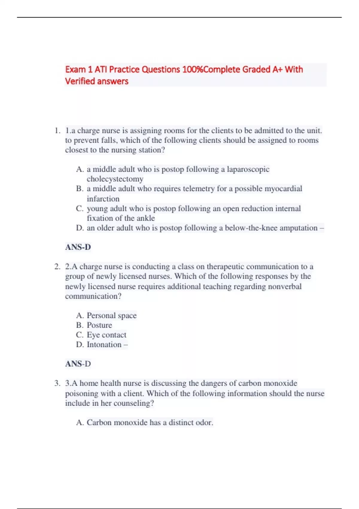Exam 1 ATI Practice Questions 100%Complete Graded A+ With Verified answers 1. 1.a charge nurse is assigning rooms for the clients to be admitted to the unit. to prevent falls, which of the following clients should be assigned to rooms closest to the nursing station? A. a middle adult who is postop following a laparoscopic cholecystectomy B. a middle adult who requires telemetry for a possible myocardial infarction C. young adult who is postop following an open reduction internal fixation of the ankle D. an older adult who is postop following a below-the-knee amputation – ANS-D 2. 2.A charge nurse is conducting a class on therapeutic communication to a group of newly licensed nurses. Which of the following responses by the newly licensed nurse requires additional teaching regarding nonverbal communication? A. Personal space B. Posture C. Eye contact D. Intonation – ANS-D 3. 3.A home health nurse is discussing the dangers of carbon monoxide poisoning with a client. Which of the following information should the nurse include in her counseling? A. Carbon monoxide has a distinct odor