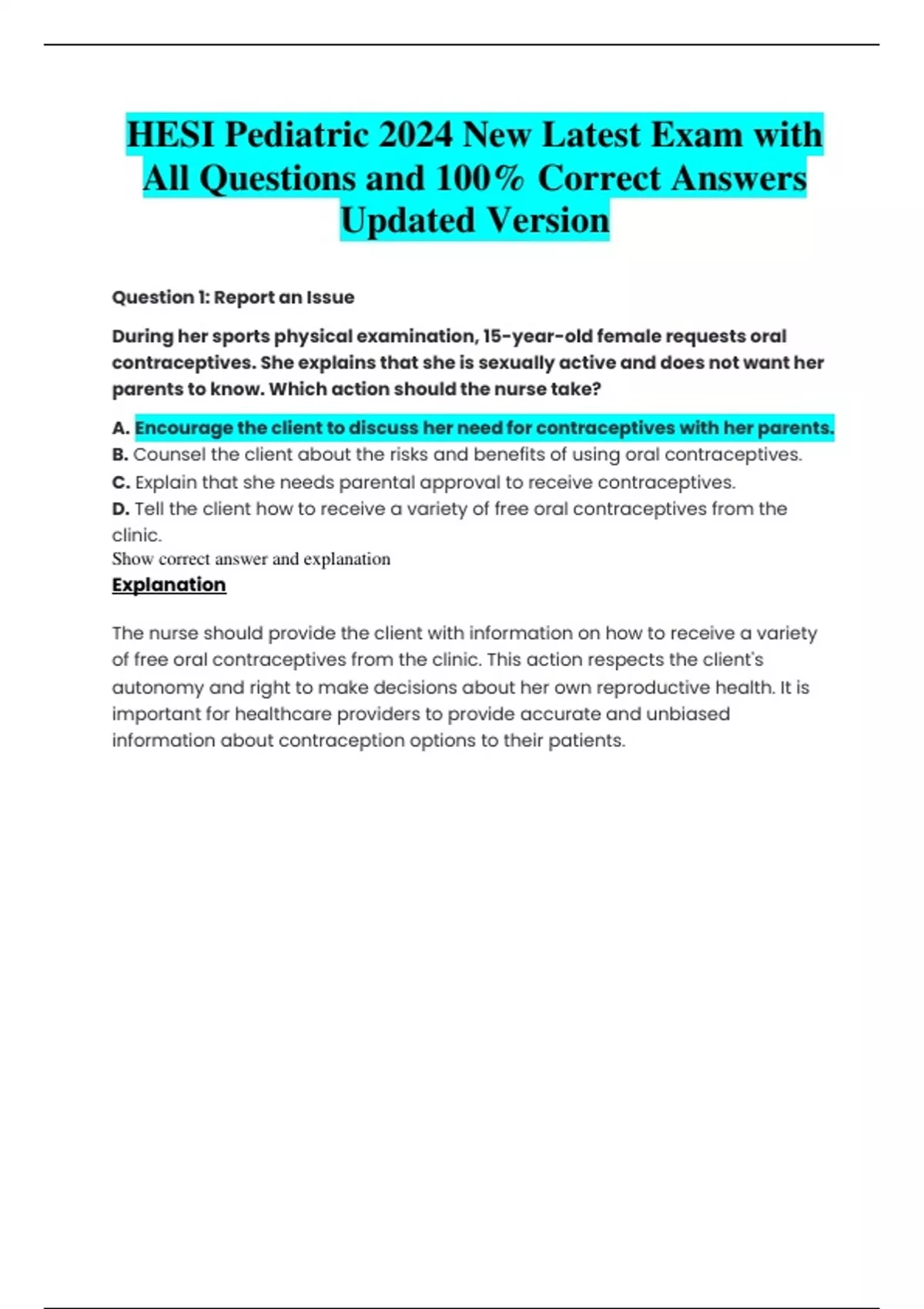 HESI Pediatric 2024 New Latest Exam with All Questions and 100% Correct Answers Updated Version