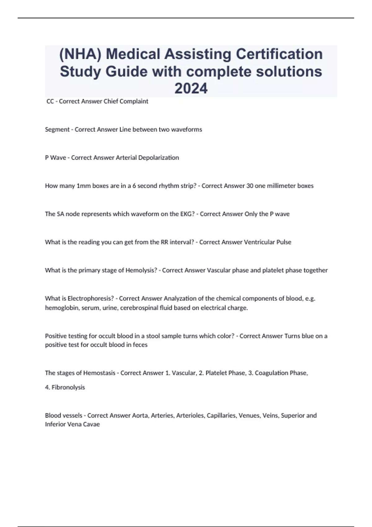 CC - Correct Answer Chief Complaint Segment - Correct Answer Line between two waveforms P Wave - Correct Answer Arterial Depolarization How many 1mm boxes are in a 6 second rhythm strip? - Correct Answer 30 one millimeter boxes The SA node represents which waveform on the EKG? - Correct Answer Only the P wave What is the reading you can get from the RR interval? - Correct Answer Ventricular Pulse What is the primary stage of Hemolysis? - Correct Answer Vascular phase and platelet phase together What is Electrophoresis? - Correct Answer Analyzation of the chemical components of blood, e.g. hemoglobin, serum, urine, cerebrospinal fluid based on electrical charge. Positive testing for occult blood in a stool sample turns which color? - Correct Answer Turns blue on a positive test for occult blood in feces The stages of Hemostasis - Correct Answer 1. Vascular, 2. Platelet Phase, 3. Coagulation Phase, 4. Fibronolysis Blood vessels - Correct Answer Aorta, Arteries, Arterioles, Capillaries, Venues, Veins, Superior and Inferior Vena Cavae