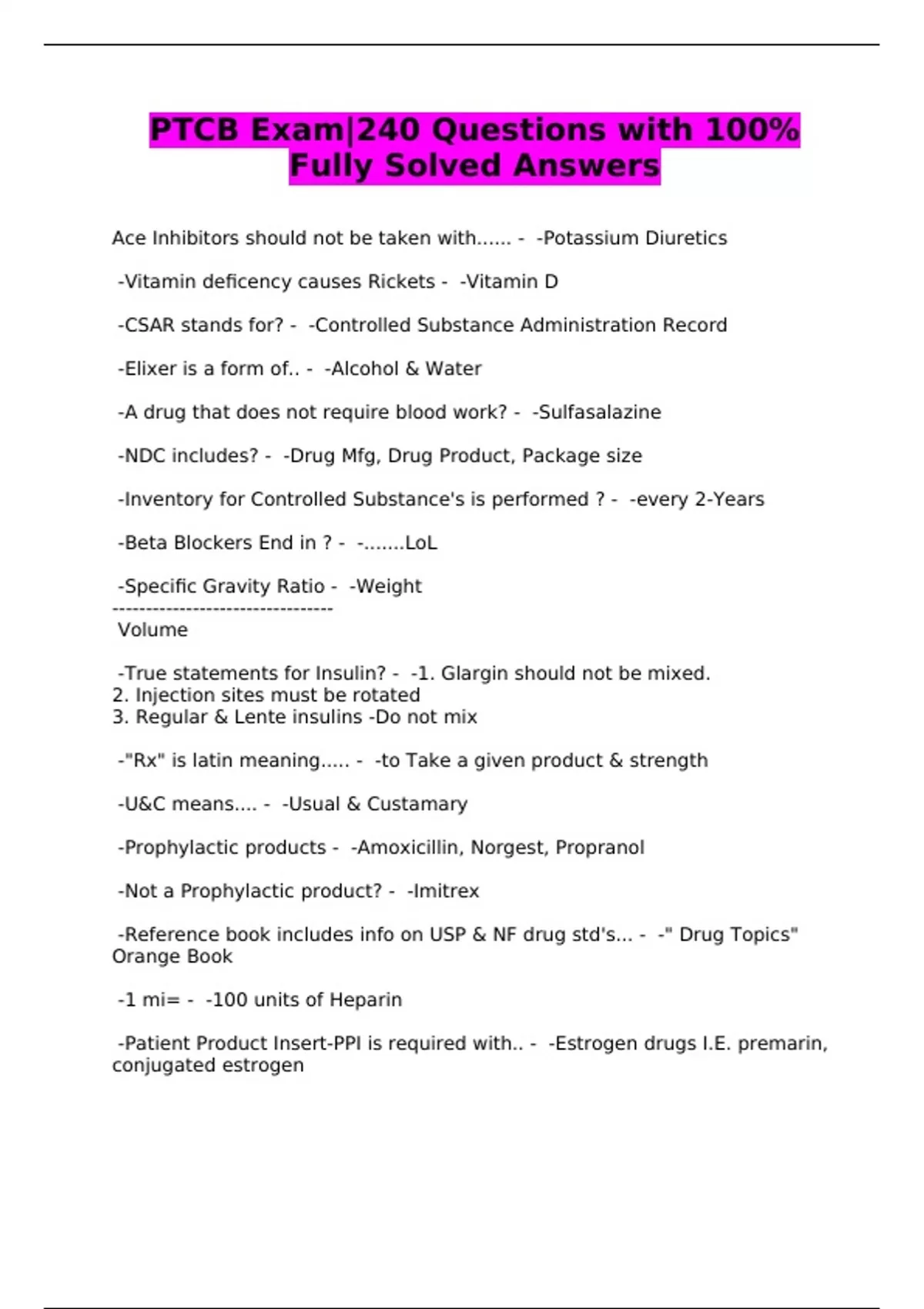 PTCB Exam|240 Questions with 100% Fully Solved Answers