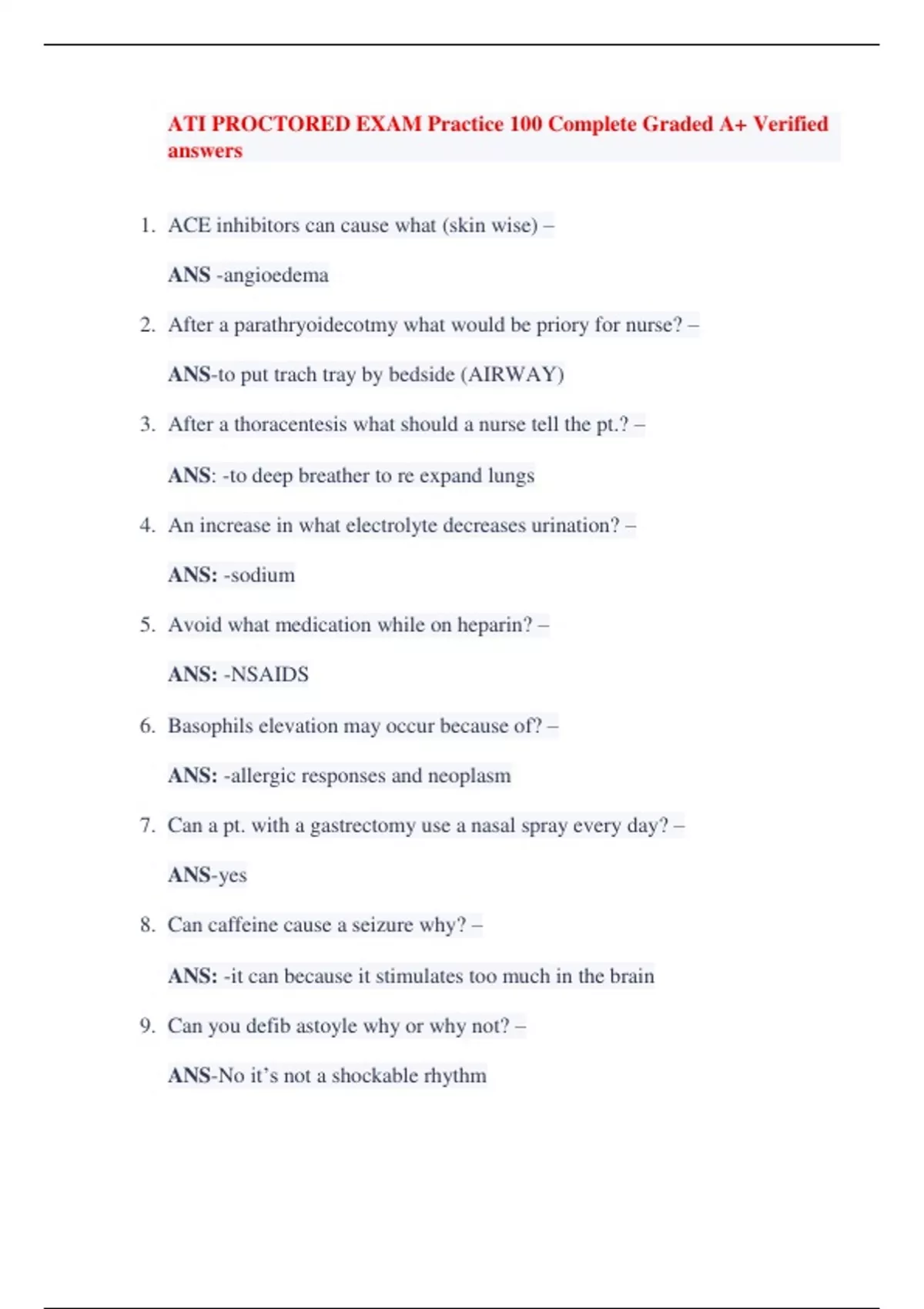 ATI PROCTORED EXAM Practice 100 Complete Graded A+ Verified answers 1. ACE inhibitors can cause what (skin wise) – ANS -angioedema 2. After a parathryoidecotmy what would be priory for nurse? – ANS-to put trach tray by bedside (AIRWAY) 3. After a thoracentesis what should a nurse tell the pt.? – ANS: -to deep breather to re expand lungs 4. An increase in what electrolyte decreases urination? – ANS: -sodium 5. Avoid what medication while on heparin? – ANS: -NSAIDS 6. Basophils elevation may occur because of? – ANS: -a