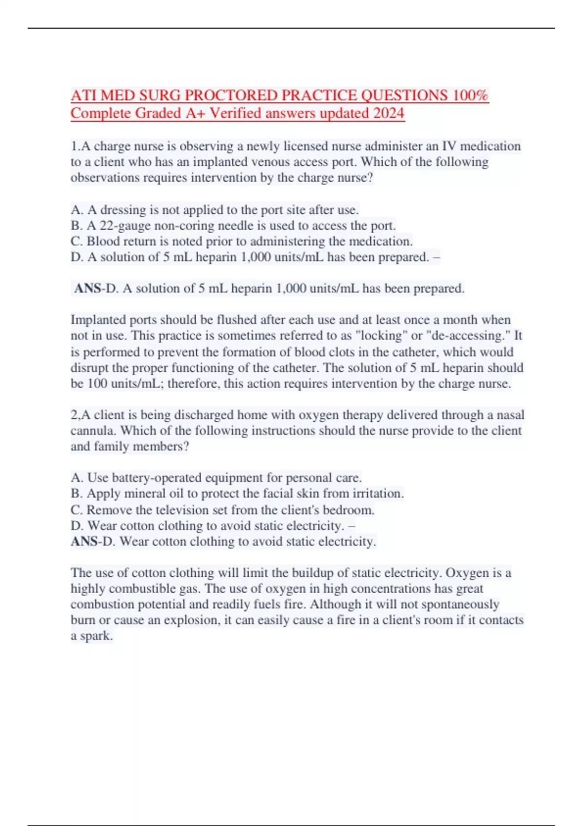 ATI MED SURG PROCTORED PRACTICE QUESTIONS 100% Complete Graded A+ Verified answers updated 2024 1.A charge nurse is observing a newly licensed nurse administer an IV medication to a client who has an implanted venous access port. Which of the following observations requires intervention by the charge nurse? A. A dressing is not applied to the port site after use. B. A 22-gauge non-coring needle is used to access the port. C. Blood return is noted prior to administering the medication. D. A solution of 5 mL heparin 1,000 units/mL has been prepared. – ANS-D. A solution of 5 mL heparin 1,000 units/mL has been prepared. Implanted ports should be flushed after each use and at least once a month when not in use. This practice is sometimes referred to as "locking" or "de-accessing." It is performed to prevent the formation of blood clots in the catheter, which would disrupt the proper functioning of the catheter. The solution of 5 mL heparin should be 100 units/mL; therefore, this action requires intervention by the charge nurse. 2,A client is being discharged home with oxygen therapy delivered through a nasal cannula. Which of the following instructions should the nurse provide to the client and family members? A. Use battery-operated equipment for personal care. B. Apply mineral oil to protect the facial skin from irritation. C. Remove the television set from the client's bedroom. D. Wear cotton clothing to avoid static electricity. – ANS-D. Wear cotton clothing to avoid static electricity. The use of cotton clothing will limit the buildup of static electricity. Oxygen is a highly combustible gas. The use of oxygen in high concentrations has great combustion potential and readily fuels fire. Although