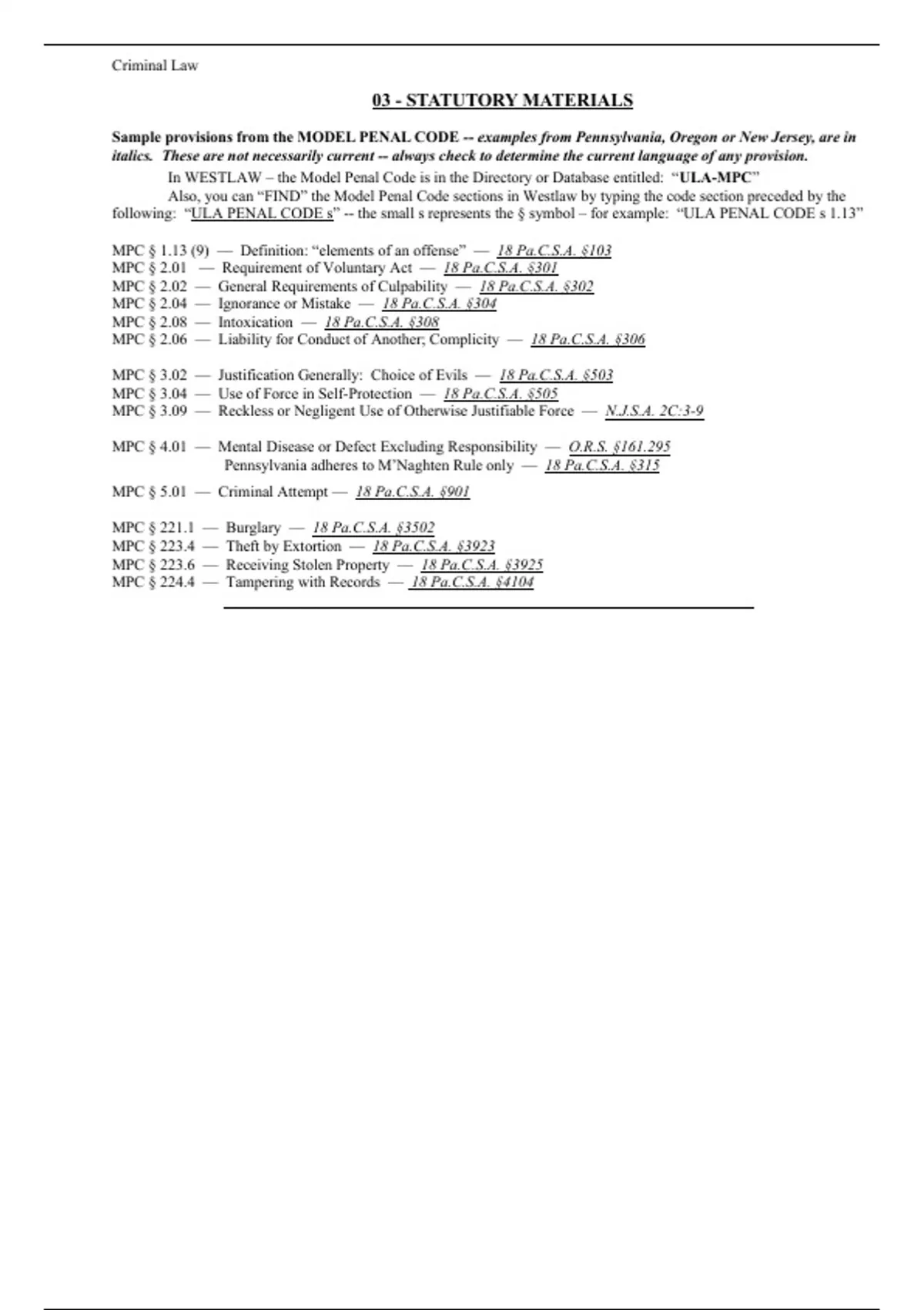 Statutory materials in criminal law