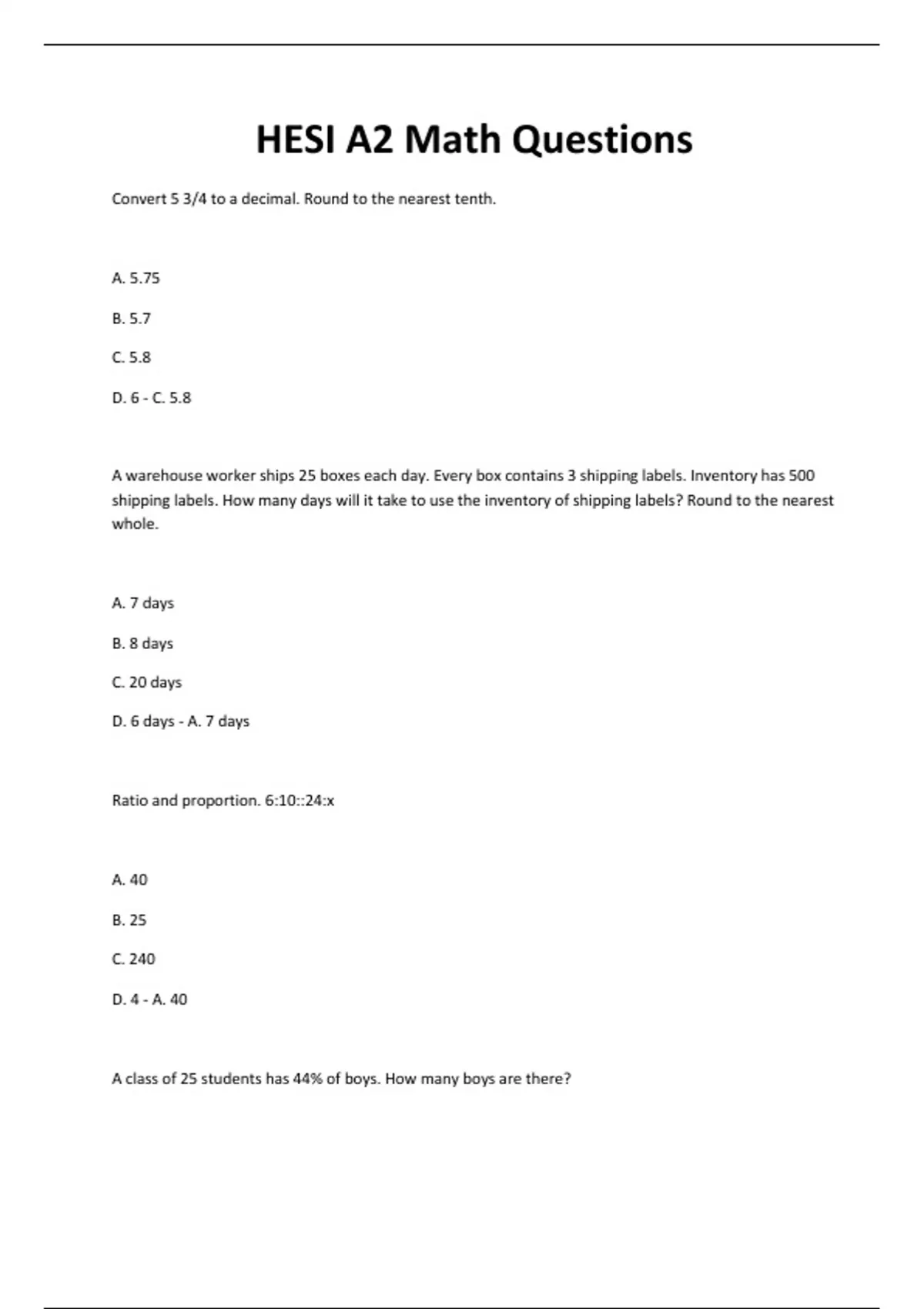 Convert 5 3/4 to a decimal. Round to the nearest tenth. A. 5.75 B. 5.7 C. 5.8 D. 6 - C. 5.8 A warehouse worker ships 25 boxes each day. Every box contains 3 shipping labels. Inventory has 500 shipping labels. How many days will it take to use the inventory of shipping labels? Round to the nearest whole. A. 7 days B. 8 days C. 20 days D. 6 days - A. 7 days Ratio and proportion. 6:10::24:x A. 40 B. 25 C. 240 D. 4 - A. 40 A class of 25 students has 44% of boys. How many boys are there? A. 10 boys B. 11 boys C. 9 boys D. 13 boys - B. 11 boys 3.44 divided by 0.6 A. 0.57 B. 5.73 C. 11.41 D. 2.33 - B. 5.73 Solve if x=11. x+44/2x A. 55/22 B. 33 C. c D. 13 - D. 13 4 & 7/8 divided by 1 & 1/6 A. 4 & 5/28 B. 4 & 6/8 C. 4 & 7/8 D. 5 & 8/14 - A. 4 & 5/28