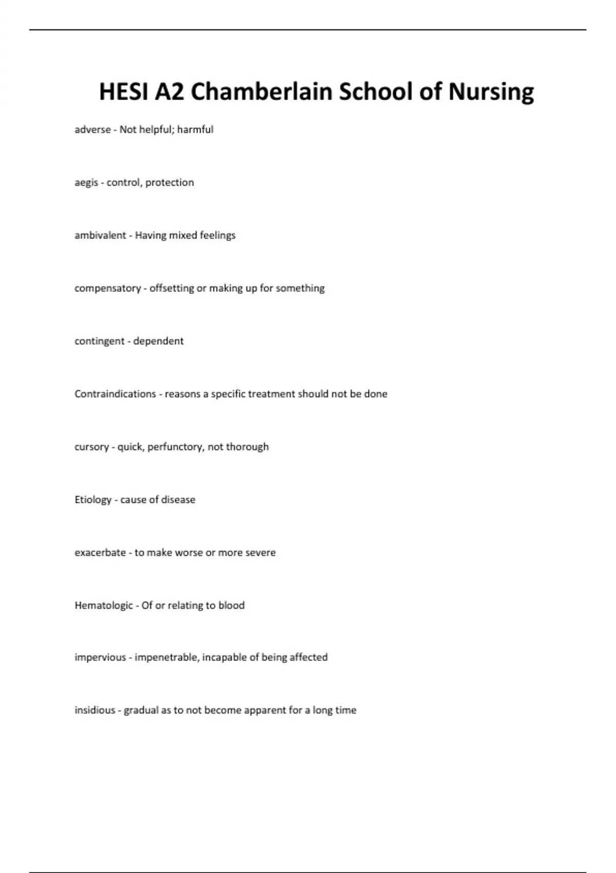 adverse - Not helpful; harmful aegis - control, protection ambivalent - Having mixed feelings compensatory - offsetting or making up for something contingent - dependent Contraindications - reasons a specific treatment should not be done cursory - quick, perfunctory, not thorough Etiology - cause of disease exacerbate - to make worse or more severe Hematologic - Of or relating to blood impervious - impenetrable, incapable of being affected insidious - gradual as to not become apparent for a long time labile - Changing rapidly and often latent - hidden, present but not realized manifestation - an indication or sign of a condition Occluded - closed or obstructed Otic - ear Parameter - A characteristic or constant factor, limit patent - to open precipitous - rapid, uncontrolled predispose - to make more susceptible or more likely to occur serene - calm, peaceful transdermal - Crossing through the skin Transmission - Transfer, such as of a disease, from one person to another ubiquitous - present or existing everywhere