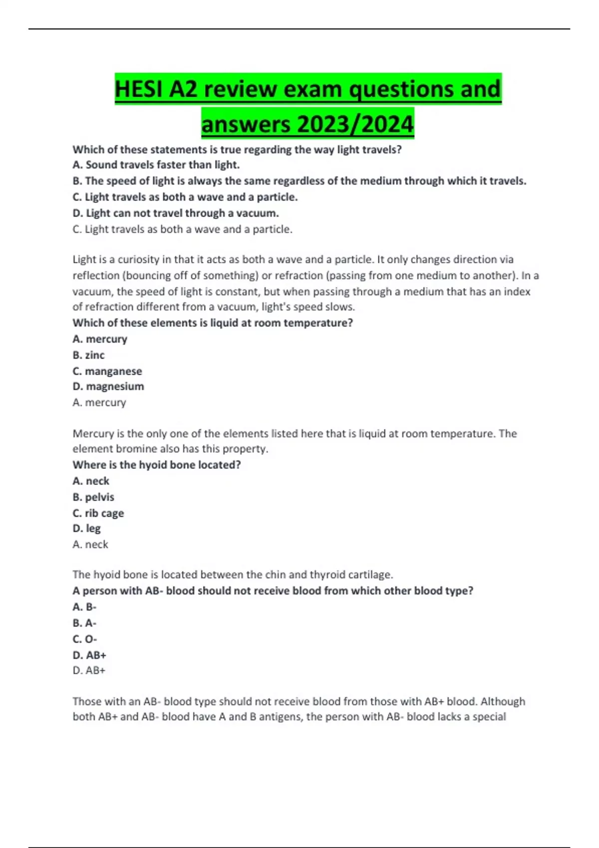 HESI A2 review exam questions and answers 2023/2024.