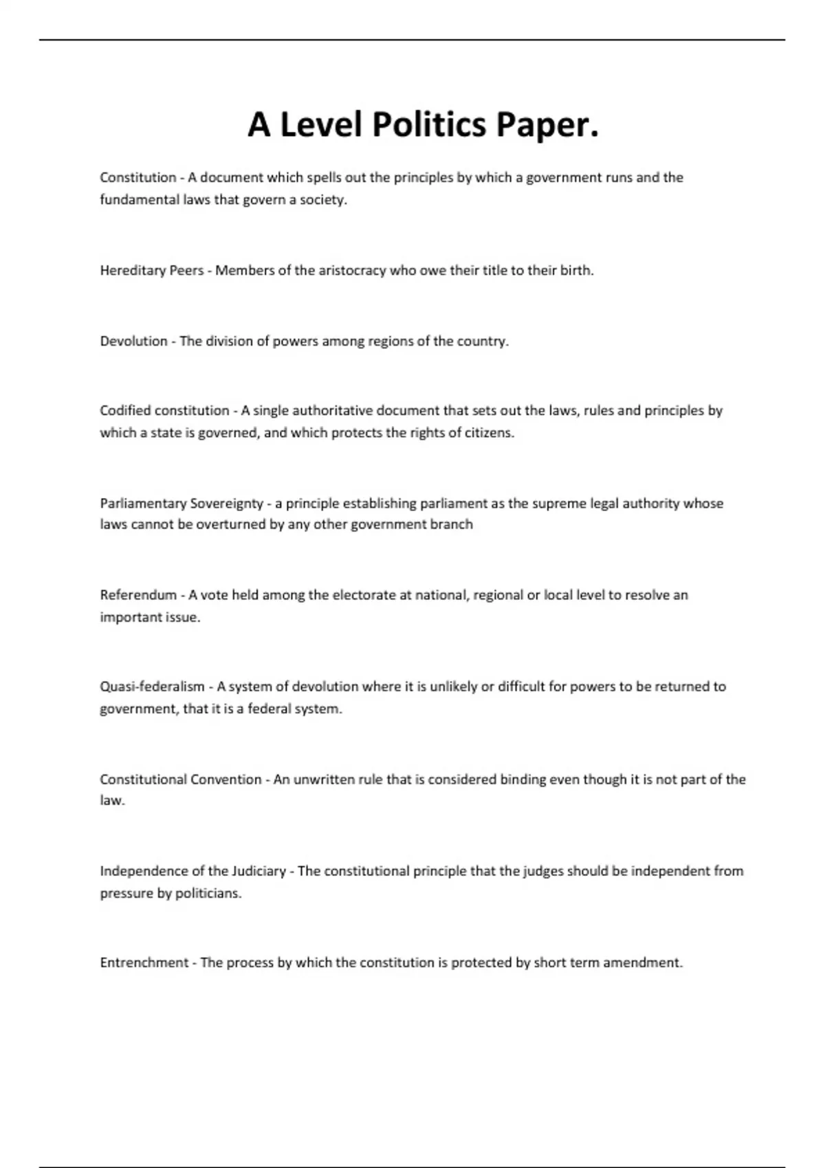 Constitution - A document which spells out the principles by which a government runs and the fundamental laws that govern a society. Hereditary Peers - Members of the aristocracy who owe their title to their birth. Devolution - The division of powers among regions of the country. Codified constitution - A single authoritative document that sets out the laws, rules and principles by which a state is governed, and which protects the rights of citizens. Parliamentary Sovereignty - a principle establishing parliament as the supreme legal authority whose laws cannot be overturned by any other government branch Referendum - A vote held among the electorate at national, regional or local level to resolve an important issue. Quasi-federalism - A system of devolution where it is unlikely or difficult for powers to be returned to government, that it is a federal system. Constitutional Convention - An unwritten rule that is considered binding even though it is not part of the law. Independence of the Judiciary - The constitutional principle that the judges should be independent from pressure by politicians. Entrenchment - The process by which the constitution is protected by short term amendment. Electoral System - The mechanism by which votes at elections are converted into seats awarded to candidates and parties. seperation of powers - The constitution agreement whereby the three branches of government - legislature, executive and judiciary - have separate powers and can control each others powers. Federalism - Divides sovereignty, or ultimate power between central government and regional governments. Why does the UK need a constitution? - - It protects the rights and civil liberties of the population - It sets up institutions to interpret the laws and punish those who do not follow them - It establishes that the government has to follow rules too, making sure it is not abusing its power. - It sets up institutions to enforce the laws - It states the functions and powers of the government - It sets up institutions that pass laws - It makes sure the government provides certain things for the people - It states how parts of the government should work together - It states roles and duties of those in government - It establishes how government is appointed. Functions of a Constitution LIMITS OF GOVERNMENT POWER - Outlines what the limits of government power should be. In the UK, there is no limit placed on parliament, as it is sovereign. Functions of a Constitution