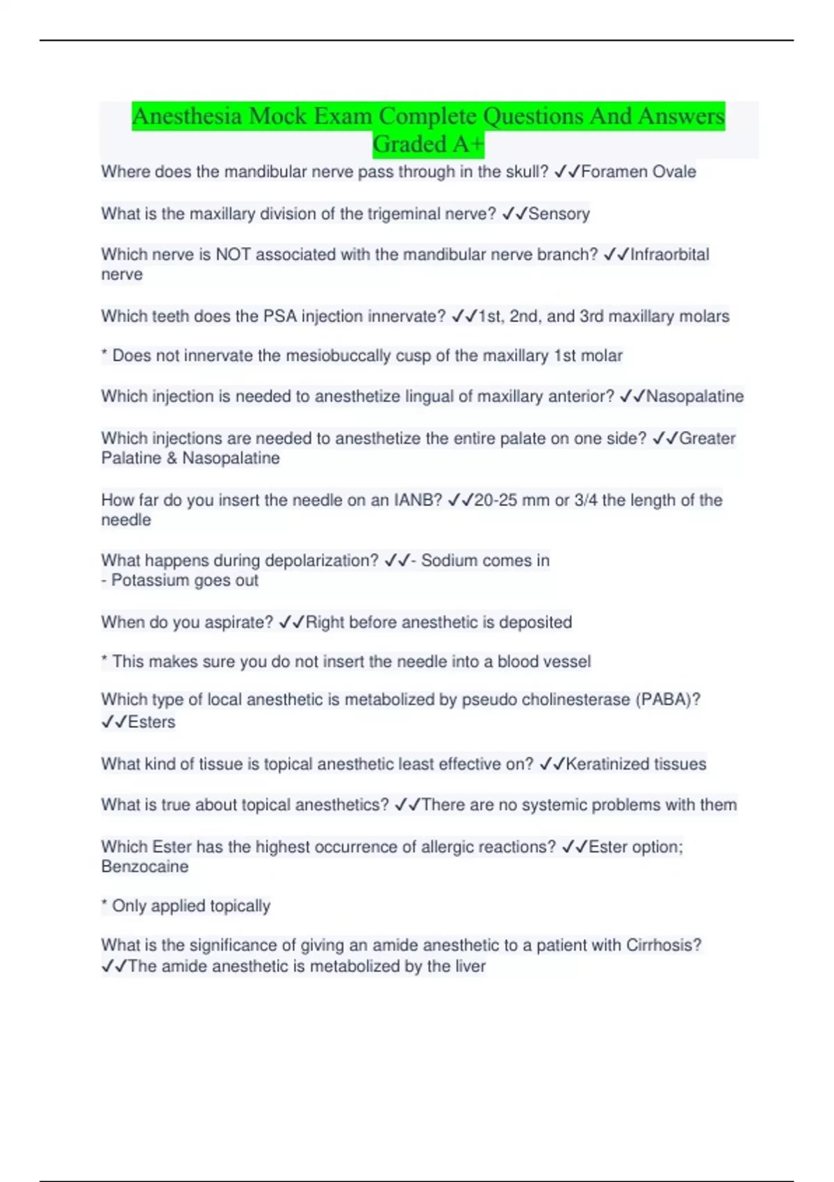Anesthesia Mock Exam Complete Questions And Answers Graded A+