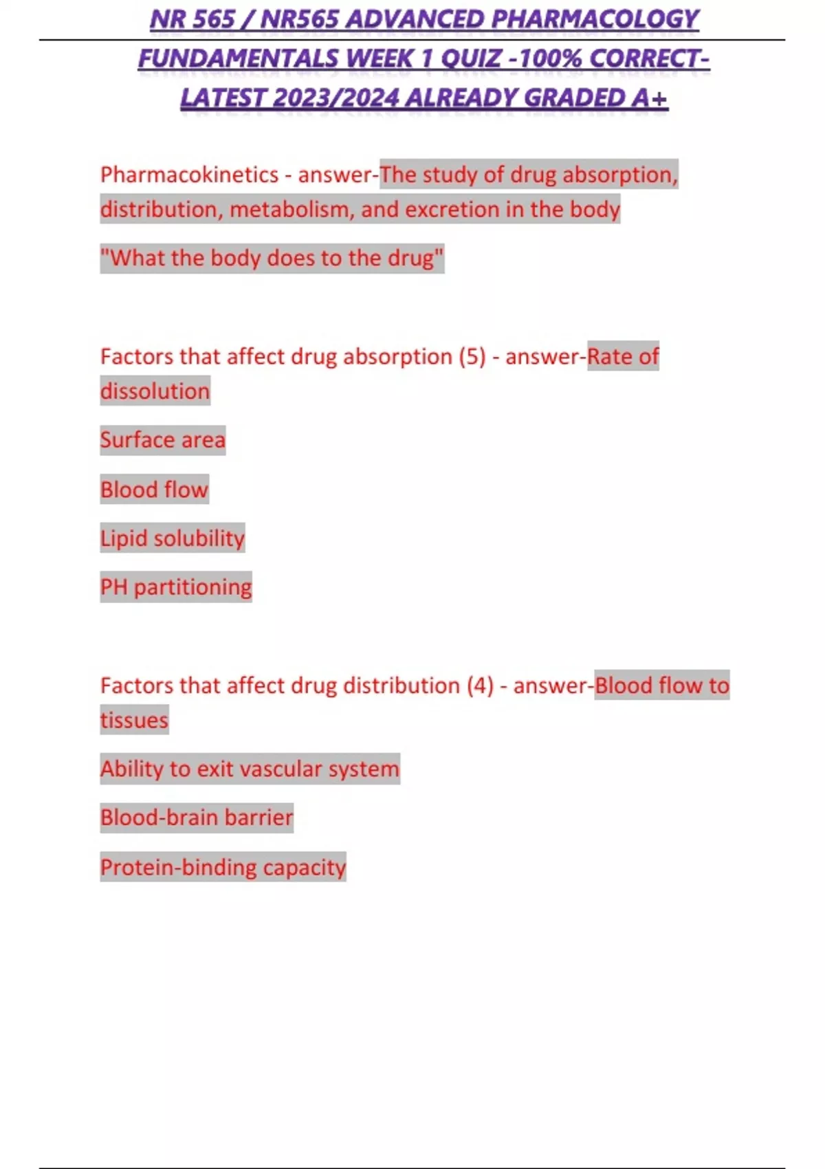 NR565 /NR565 ADVANCED PHARMACOLOGY FUNDAMENTALS WEEK 1 QUIZ -100% CORRECT LATEST 2023/ 2024 ALREADY GRADED A+