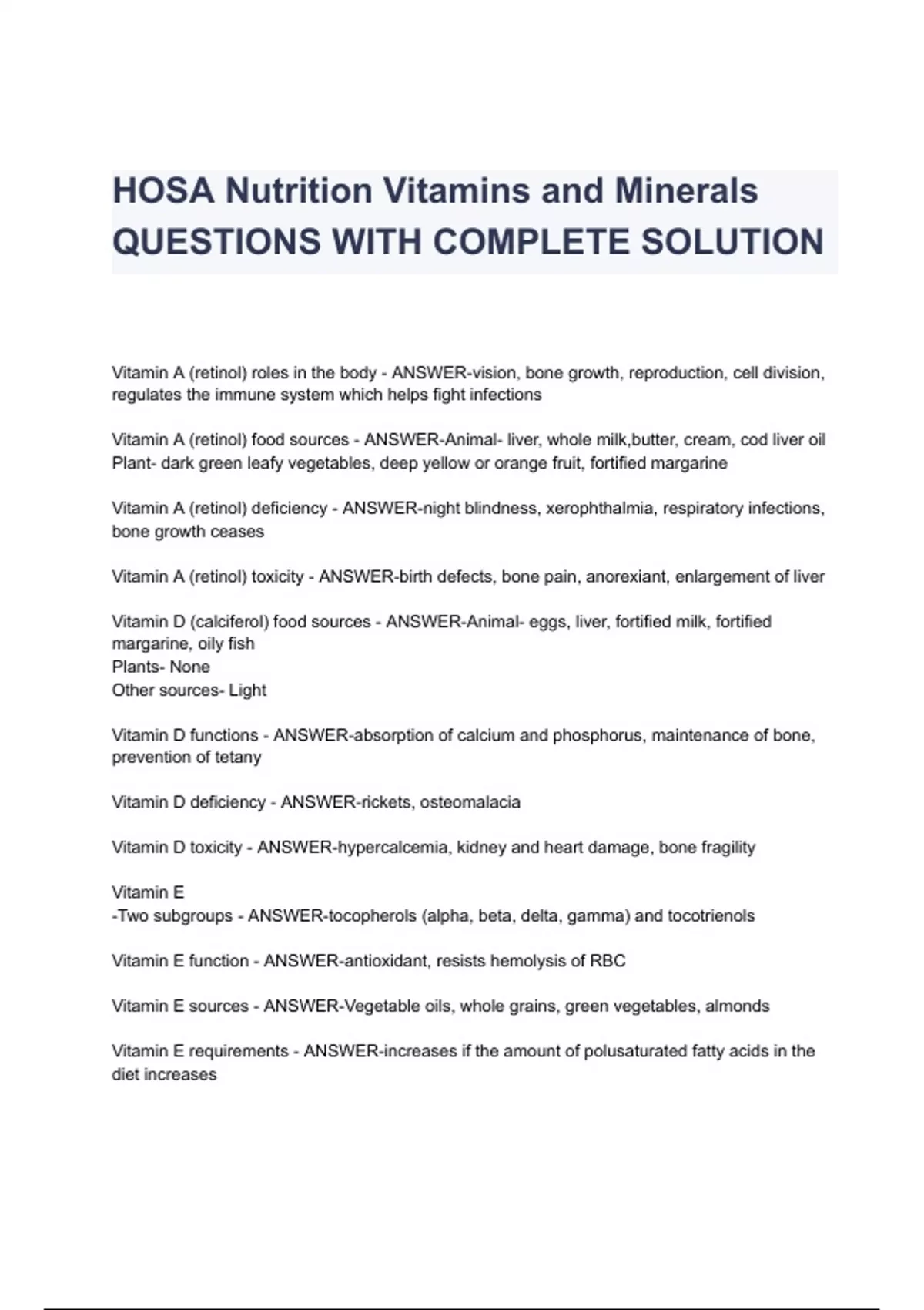 HOSA Nutrition Vitamins and Minerals QUESTIONS WITH COMPLETE SOLUTION