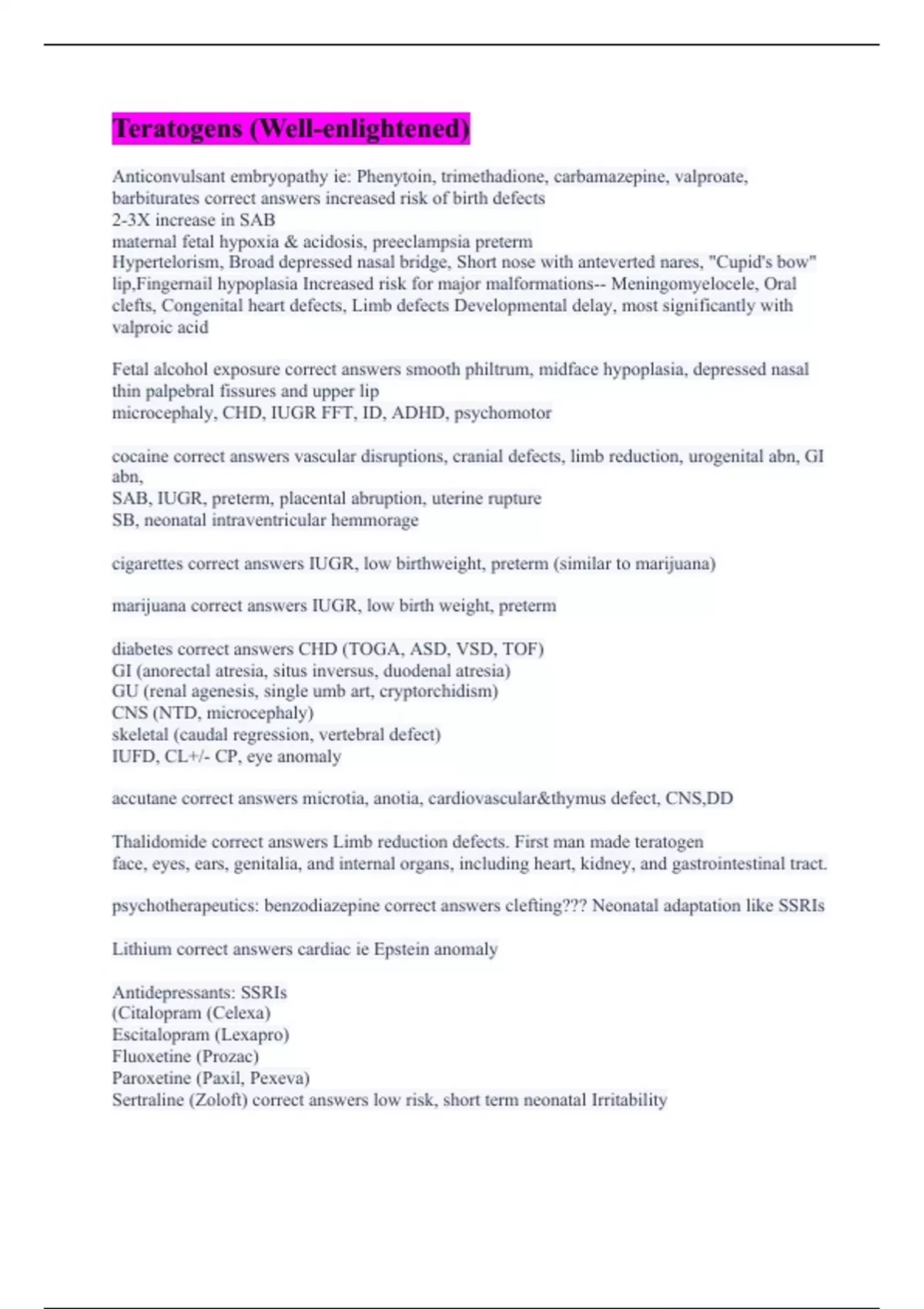 Anticonvulsant embryopathy ie: Phenytoin, trimethadione, carbamazepine, valproate, barbiturates correct answers increased risk of birth defects 2-3X increase in SAB maternal fetal hypoxia & acidosis, preeclampsia preterm Hypertelorism, Broad depressed nasal bridge, Short nose with anteverted nares, "Cupid's bow" lip,Fingernail hypoplasia Increased risk for major malformations-- Meningomyelocele, Oral clefts, Congenital heart defects, Limb defects Developmental delay, most significantly with valproic acid Fetal alcohol exposure correct answers smooth philtrum, midface hypoplasia, depressed nasal thin palpebral fissures and upper lip microcephaly, CHD, IUGR FFT, ID, ADHD, psychomotor cocaine correct answers vascular disruptions, cranial defects, limb reduction, urogenital abn, GI abn, SAB, IUGR, preterm, placental abruption, uterine rupture SB, neonatal intraventricular hemmorage cigarettes correct answers IUGR, low birthweight, preterm (similar to marijuana) marijuana correct answers IUGR, low birth weight, preterm diabetes correct answers CHD (TOGA, ASD, VSD, TOF) GI (anorectal atresia, situs inversus, duodenal atresia) GU (renal agenesis, single umb art, cryptorchidism) CNS (NTD, microcephaly) skeletal (caudal regression, vertebral defect) IUFD, CL+/- CP, eye anomaly accutane correct answers microtia, anotia, cardiovascular&thymus defect, CNS,DD Thalidomide correct answers Limb reduction defects. First man made teratogen face, eyes, ears, genitalia, and internal organs, including heart, kidney, and gastrointestinal tract. psychotherapeutics: benzodiazepine correct answers clefting??? Neonatal adaptation like SSRIs Lithium correct answers cardiac ie Epstein anomaly Antidepressants: SSRIs (Citalopram (Celexa) Escitalopram (Lexapro) Fluoxetine (Prozac) Paroxetine (Paxil, Pexeva) Sertraline (Zoloft) correct answers low risk, short term neonatal Irritability