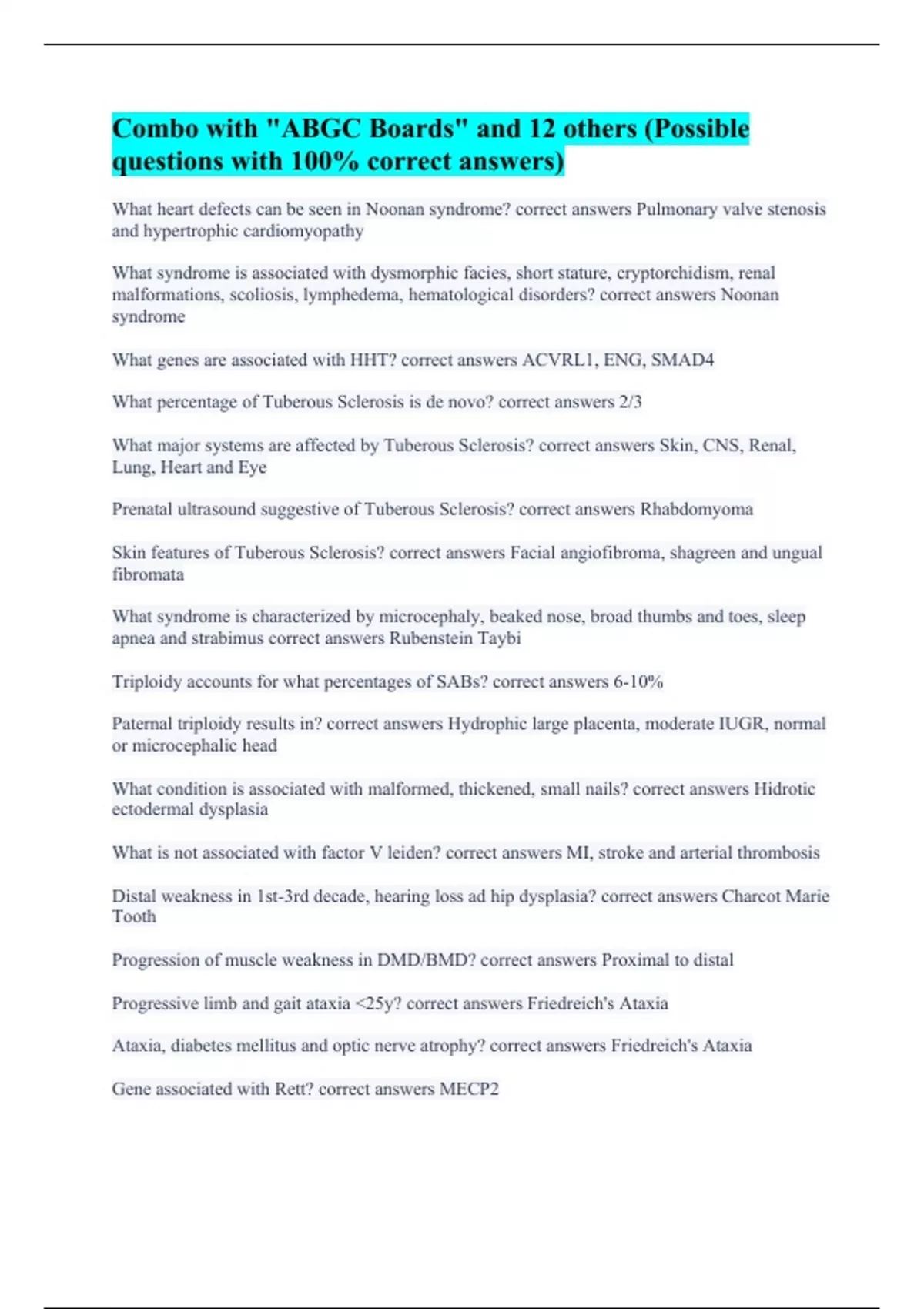 What heart defects can be seen in Noonan syndrome? correct answers Pulmonary valve stenosis and hypertrophic cardiomyopathy What syndrome is associated with dysmorphic facies, short stature, cryptorchidism, renal malformations, scoliosis, lymphedema, hematological disorders? correct answers Noonan syndrome What genes are associated with HHT? correct answers ACVRL1, ENG, SMAD4 What percentage of Tuberous Sclerosis is de novo? correct answers 2/3 What major systems are affected by Tuberous Sclerosis? correct answers Skin, CNS, Renal, Lung, Heart and Eye Prenatal ultrasound suggestive of Tuberous Sclerosis? correct answers Rhabdomyoma Skin features of Tuberous Sclerosis? correct answers Facial angiofibroma, shagreen and ungual fibromata What syndrome is characterized by microcephaly, beaked nose, broad thumbs and toes, sleep apnea and strabimus correct answers Rubenstein Taybi Triploidy accounts for what percentages of SABs? correct answers 6-10% Paternal triploidy results in? correct answers Hydrophic large placenta, moderate IUGR, normal or microcephalic head What condition is associated with malformed, thickened, small nails? correct answers Hidrotic ectodermal dysplasia What is not associated with factor V leiden? correct answers MI, stroke and arterial thrombosis Distal weakness in 1st-3rd decade, hearing loss ad hip dysplasia? correct answers Charcot Marie Tooth Progression of muscle weakness in DMD/BMD? correct answers Proximal to distal Progressive limb and gait ataxia <25y? correct answers Friedreich's Ataxia Ataxia, diabetes mellitus and optic nerve atrophy? correct answers Friedreich's Ataxia Gene associated with Rett? correct answers MECP2