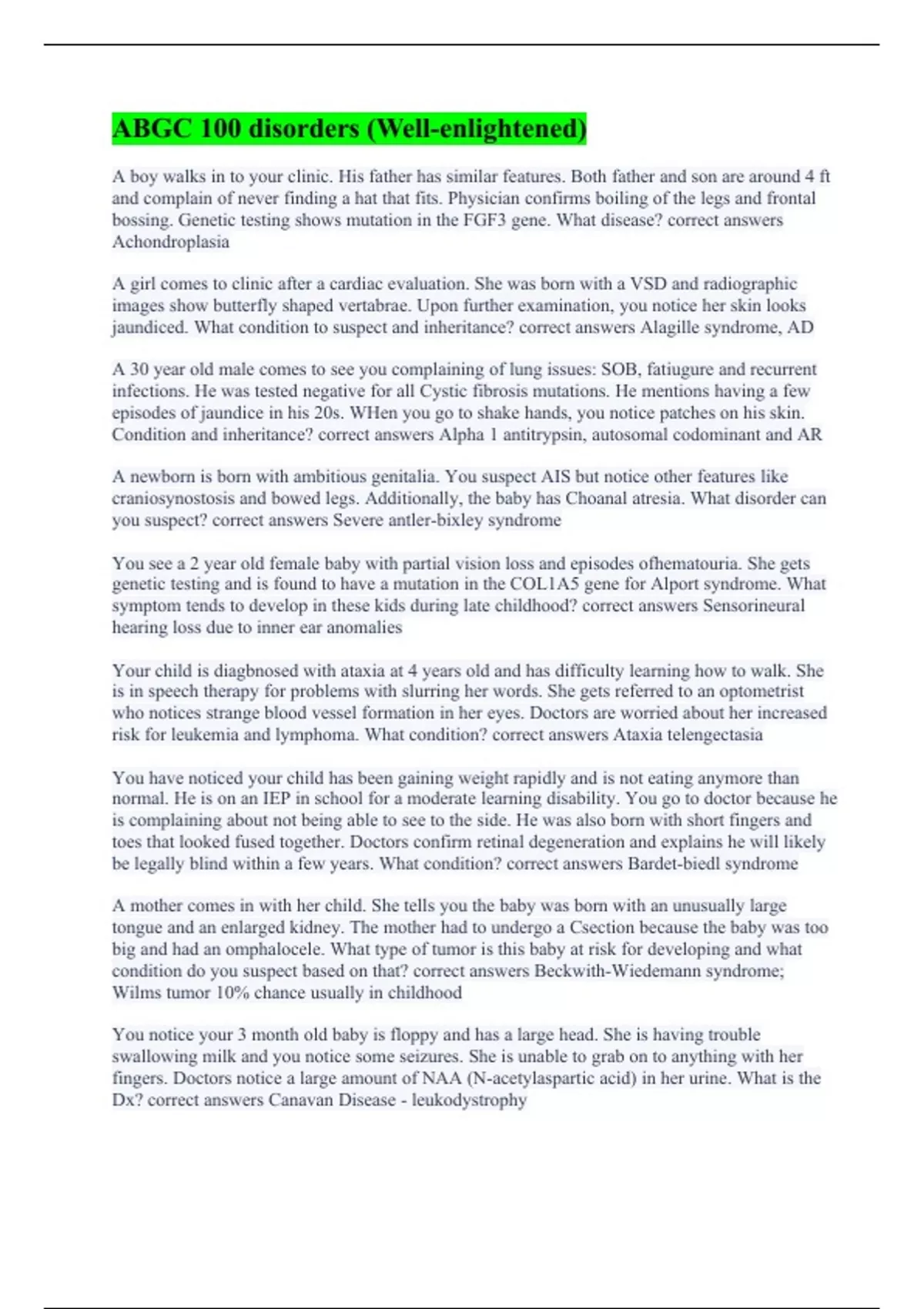 A boy walks in to your clinic. His father has similar features. Both father and son are around 4 ft and complain of never finding a hat that fits. Physician confirms boiling of the legs and frontal bossing. Genetic testing shows mutation in the FGF3 gene. What disease? correct answers Achondroplasia A girl comes to clinic after a cardiac evaluation. She was born with a VSD and radiographic images show butterfly shaped vertabrae. Upon further examination, you notice her skin looks jaundiced. What condition to suspect and inheritance? correct answers Alagille syndrome, AD A 30 year old male comes to see you complaining of lung issues: SOB, fatiugure and recurrent infections. He was tested negative for all Cystic fibrosis mutations. He mentions having a few episodes of jaundice in his 20s. WHen you go to shake hands, you notice patches on his skin. Condition and inheritance? correct answers Alpha 1 antitrypsin, autosomal codominant and AR A newborn is born with ambitious genitalia. You suspect AIS but notice other features like craniosynostosis and bowed legs. Additionally, the baby has Choanal atresia. What disorder can you suspect? correct answers Severe antler-bixley syndrome You see a 2 year old female baby with partial vision loss and episodes ofhematouria. She gets genetic testing and is found to have a mutation in the COL1A5 gene for Alport syndrome. What symptom tends to develop in these kids during late childhood? correct answers Sensorineural hearing loss due to inner ear anomalies Your child is diagbnosed with ataxia at 4 years old and has difficulty learning how to walk. She is in speech therapy for problems with slurring her words. She gets referred to an optometrist who notices strange blood vessel formation in her eyes. Doctors are worried about her increased risk for leukemia and lymphoma. What condition? correct answers Ataxia telengectasia You have noticed your child has been gaining weight rapidly and is not eating anymore than normal. He is on an IEP in school for a moderate learning disability. You go to doctor because he is complaining about not being able to see to the side. He was also born with short fingers and toes that looked fused together. Doctors confirm retinal degeneration and explains he will likely be legally blind within a few years. What condition? correct answers Bardet-biedl syndrome A mother comes in with her child. She tells you the baby was born with an unusually large tongue and an enlarged kidney. The mother had to undergo a Csection because the baby was too big and had an omphalocele. What type of tumor is this baby at risk for developing and what condition do you suspect based on that? correct answers Beckwith-Wiedemann syndrome; Wilms tumor 10% chance usually in childhood You notice your 3 month old baby is floppy and has a large head. She is having trouble swallowing milk and you notice some seizures. She is unable to grab on to anything with her fingers. Doctors notice a large amount of NAA (N-acetylaspartic acid) in her urine. What is the Dx? correct answers Canavan Disease - leukodystrophy