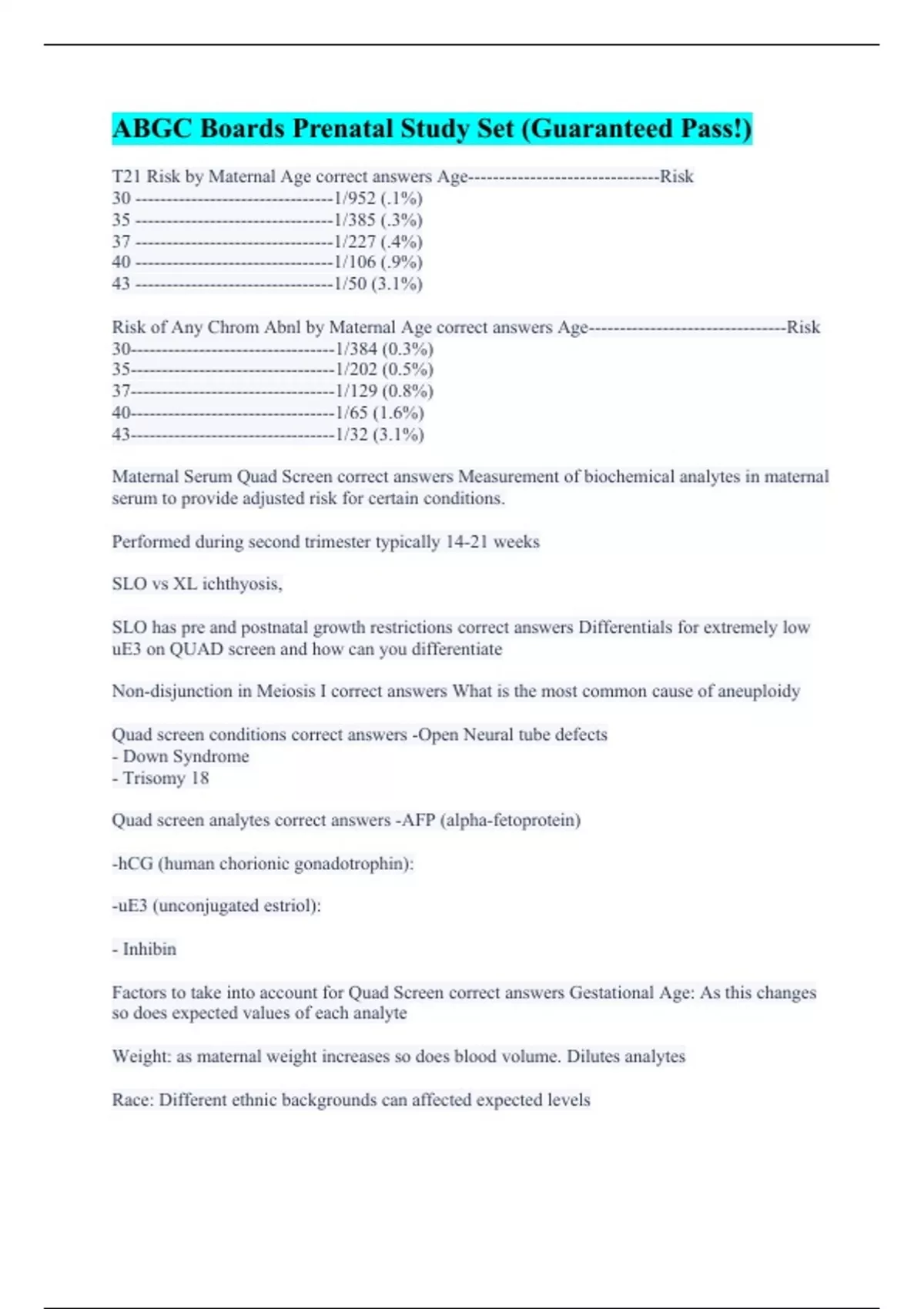 T21 Risk by Maternal Age correct answers Age-------------------------------Risk 30 --------------------------------1/952 (.1%) 35 --------------------------------1/385 (.3%) 37 --------------------------------1/227 (.4%) 40 --------------------------------1/106 (.9%) 43 --------------------------------1/50 (3.1%) Risk of Any Chrom Abnl by Maternal Age correct answers Age--------------------------------Risk 30---------------------------------1/384 (0.3%) 35---------------------------------1/202 (0.5%) 37---------------------------------1/129 (0.8%) 40---------------------------------1/65 (1.6%) 43---------------------------------1/32 (3.1%) Maternal Serum Quad Screen correct answers Measurement of biochemical analytes in maternal serum to provide adjusted risk for certain conditions. Performed during second trimester typically 14-21 weeks SLO vs XL ichthyosis, SLO has pre and postnatal growth restrictions correct answers Differentials for extremely low uE3 on QUAD screen and how can you differentiate Non-disjunction in Meiosis I correct answers What is the most common cause of aneuploidy Quad screen conditions correct answers -Open Neural tube defects - Down Syndrome - Trisomy 18 Quad screen analytes correct answers -AFP (alpha-fetoprotein) -hCG (human chorionic gonadotrophin): -uE3 (unconjugated estriol): - Inhibin Factors to take into account for Quad Screen correct answers Gestational Age: As this changes so does expected values of each analyte Weight: as maternal weight increases so does blood volume. Dilutes analytes Race: Different ethnic backgrounds can affected expected levels