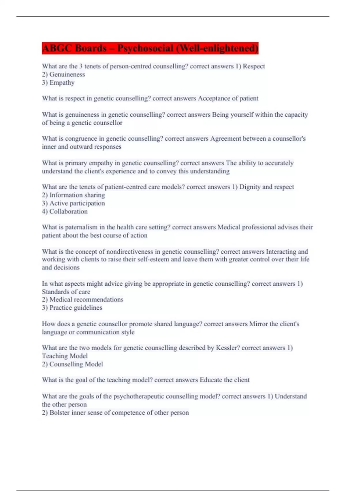 What are the 3 tenets of person-centred counselling? correct answers 1) Respect 2) Genuineness 3) Empathy What is respect in genetic counselling? correct answers Acceptance of patient What is genuineness in genetic counselling? correct answers Being yourself within the capacity of being a genetic counsellor What is congruence in genetic counselling? correct answers Agreement between a counsellor's inner and outward responses What is primary empathy in genetic counselling? correct answers The ability to accurately understand the client's experience and to convey this understanding What are the tenets of patient-centred care models? correct answers 1) Dignity and respect 2) Information sharing 3) Active participation 4) Collaboration What is paternalism in the health care setting? correct answers Medical professional advises their patient about the best course of action What is the concept of nondirectiveness in genetic counselling? correct answers Interacting and working with clients to raise their self-esteem and leave them with greater control over their life and decisions In what aspects might advice giving be appropriate in genetic counselling? correct answers 1) Standards of care 2) Medical recommendations 3) Practice guidelines How does a genetic counsellor promote shared language? correct answers Mirror the client's language or communication style What are the two models for genetic counselling described by Kessler? correct answers 1) Teaching Model 2) Counselling Model What is the goal of the teaching model? correct answers Educate the client What are the goals of the psychotherapeutic counselling model? correct answers 1) Understand the other person 2) Bolster inner sense of competence of other person