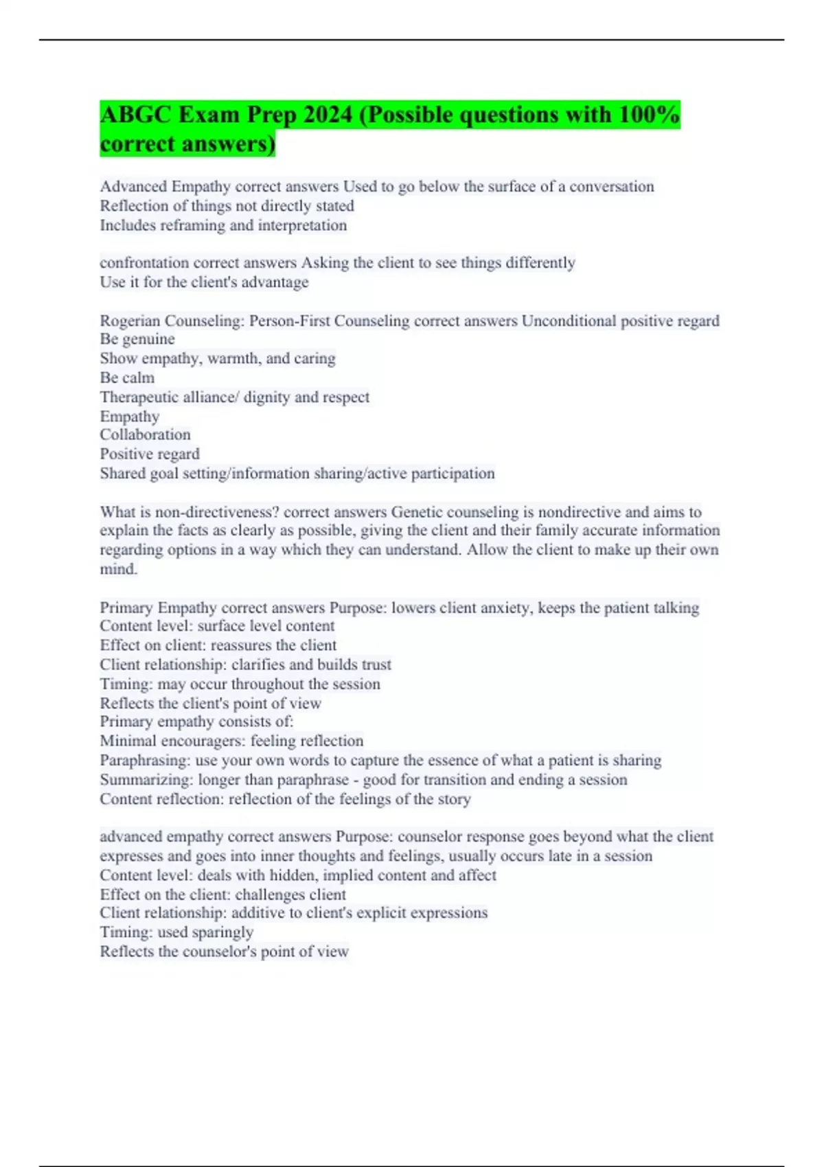 Advanced Empathy correct answers Used to go below the surface of a conversation Reflection of things not directly stated Includes reframing and interpretation confrontation correct answers Asking the client to see things differently Use it for the client's advantage Rogerian Counseling: Person-First Counseling correct answers Unconditional positive regard Be genuine Show empathy, warmth, and caring Be calm Therapeutic alliance/ dignity and respect Empathy Collaboration Positive regard Shared goal setting/information sharing/active participation What is non-directiveness? correct answers Genetic counseling is nondirective and aims to explain the facts as clearly as possible, giving the client and their family accurate information regarding options in a way which they can understand. Allow the client to make up their own mind. Primary Empathy correct answers Purpose: lowers client anxiety, keeps the patient talking Content level: surface level content Effect on client: reassures the client Client relationship: clarifies and builds trust Timing: may occur throughout the session Reflects the client's point of view Primary empathy consists of: Minimal encouragers: feeling reflection Paraphrasing: use your own words to capture the essence of what a patient is sharing Summarizing: longer than paraphrase - good for transition and ending a session Content reflection: reflection of the feelings of the story advanced empathy correct answers Purpose: counselor response goes beyond what the client expresses and goes into inner thoughts and feelings, usually occurs late in a session Content level: deals with hidden, implied content and affect Effect on the client: challenges client Client relationship: additive to client's explicit expressions Timing: used sparingly Reflects the counselor's point of view