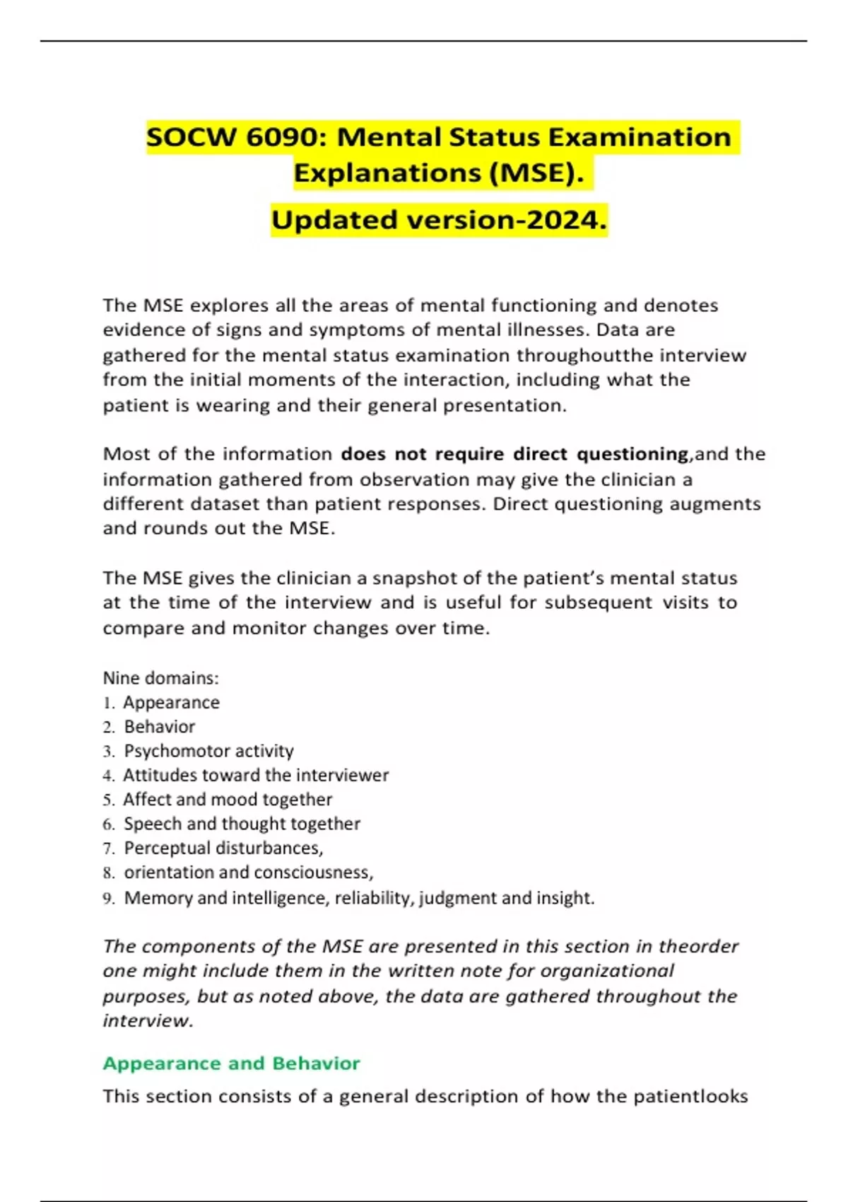 SOCW 6090: Mental Status Examination Explanations (MSE). Updated version-2024.