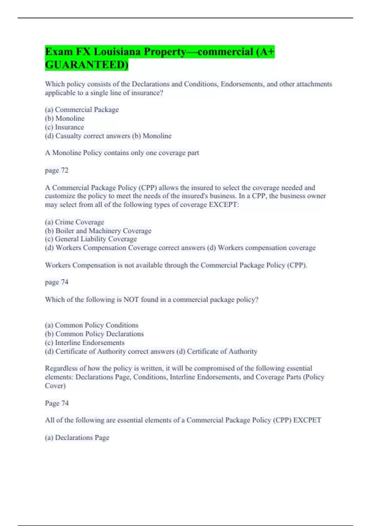 Which policy consists of the Declarations and Conditions, Endorsements, and other attachments applicable to a single line of insurance? (a) Commercial Package (b) Monoline (c) Insurance (d) Casualty correct answers (b) Monoline A Monoline Policy contains only one coverage part page 72 A Commercial Package Policy (CPP) allows the insured to select the coverage needed and customize the policy to meet the needs of the insured's business. In a CPP, the business owner may select from all of the following types of coverage EXCEPT: (a) Crime Coverage (b) Boiler and Machinery Coverage (c) General Liability Coverage (d) Workers Compensation Coverage correct answers (d) Workers compensation coverage Workers Compensation is not available through the Commercial Package Policy (CPP). page 74 Which of the following is NOT found in a commercial package policy? (a) Common Policy Conditions (b) Common Policy Declarations (c) Interline Endorsements (d) Certificate of Authority correct answers (d) Certificate of Authority Regardless of how the policy is written, it will be compromised of the following essential elements: Declarations Page, Conditions, Interline Endorsements, and Coverage Parts (Policy Cover) Page 74 All of the following are essential elements of a Commercial Package Policy (CPP) EXCPET (a) Declarations Page