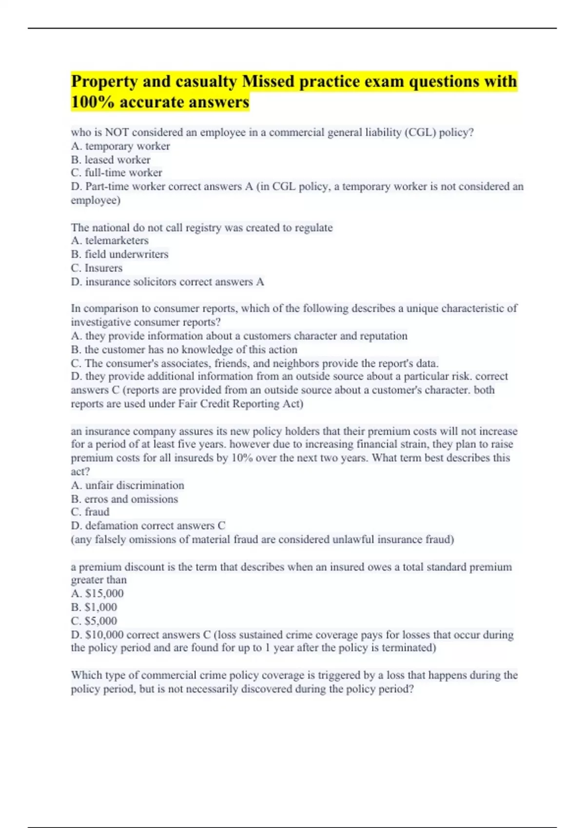 who is NOT considered an employee in a commercial general liability (CGL) policy? A. temporary worker B. leased worker C. full-time worker D. Part-time worker correct answers A (in CGL policy, a temporary worker is not considered an employee) The national do not call registry was created to regulate A. telemarketers B. field underwriters C. Insurers D. insurance solicitors correct answers A In comparison to consumer reports, which of the following describes a unique characteristic of investigative consumer reports? A. they provide information about a customers character and reputation B. the customer has no knowledge of this action C. The consumer's associates, friends, and neighbors provide the report's data. D. they provide additional information from an outside source about a particular risk. correct answers C (reports are provided from an outside source about a customer's character. both reports are used under Fair Credit Reporting Act) an insurance company assures its new policy holders that their premium costs will not increase for a period of at least five years. however due to increasing financial strain, they plan to raise premium costs for all insureds by 10% over the next two years. What term best describes this act? A. unfair discrimination B. erros and omissions C. fraud D. defamation correct answers C (any falsely omissions of material fraud are considered unlawful insurance fraud) a premium discount is the term that describes when an insured owes a total standard premium greater than A. $15,000 B. $1,000 C. $5,000 D. $10,000 correct answers C (loss sustained crime coverage pays for losses that occur during the policy period and are found for up to 1 year after the policy is terminated) Which type of commercial crime policy coverage is triggered by a loss that happens during the policy period, but is not necessarily discovered during the policy period?