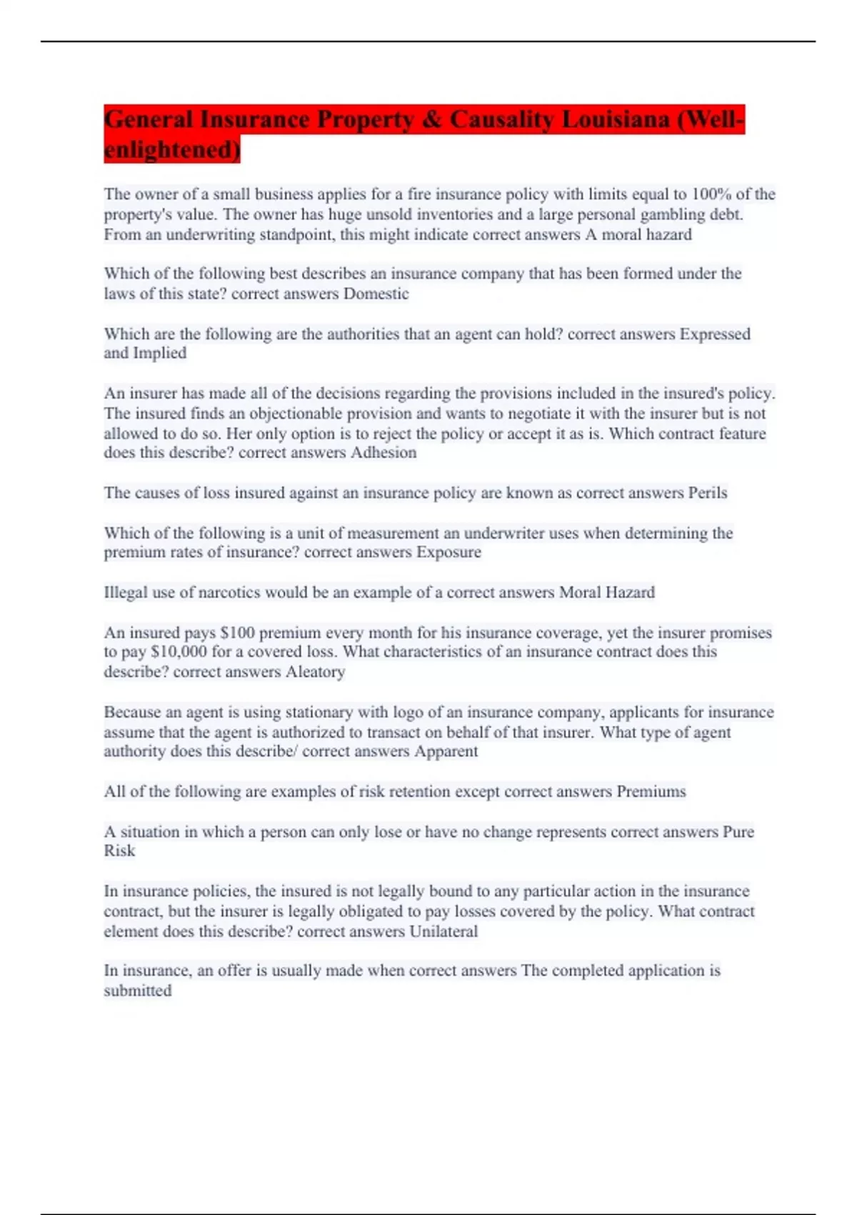 The owner of a small business applies for a fire insurance policy with limits equal to 100% of the property's value. The owner has huge unsold inventories and a large personal gambling debt. From an underwriting standpoint, this might indicate correct answers A moral hazard Which of the following best describes an insurance company that has been formed under the laws of this state? correct answers Domestic Which are the following are the authorities that an agent can hold? correct answers Expressed and Implied An insurer has made all of the decisions regarding the provisions included in the insured's policy. The insured finds an objectionable provision and wants to negotiate it with the insurer but is not allowed to do so. Her only option is to reject the policy or accept it as is. Which contract feature does this describe? correct answers Adhesion The causes of loss insured against an insurance policy are known as correct answers Perils Which of the following is a unit of measurement an underwriter uses when determining the premium rates of insurance? correct answers Exposure Illegal use of narcotics would be an example of a correct answers Moral Hazard An insured pays $100 premium every month for his insurance coverage, yet the insurer promises to pay $10,000 for a covered loss. What characteristics of an insurance contract does this describe? correct answers Aleatory Because an agent is using stationary with logo of an insurance company, applicants for insurance assume that the agent is authorized to transact on behalf of that insurer. What type of agent authority does this describe/ correct answers Apparent All of the following are examples of risk retention except correct answers Premiums A situation in which a person can only lose or have no change represents correct answers Pure Risk In insurance policies, the insured is not legally bound to any particular action in the insurance contract, but the insurer is legally obligated to pay losses covered by the policy. What contract element does this describe? correct answers Unilateral In insurance, an offer is usually made when correct answers The completed application is submitted