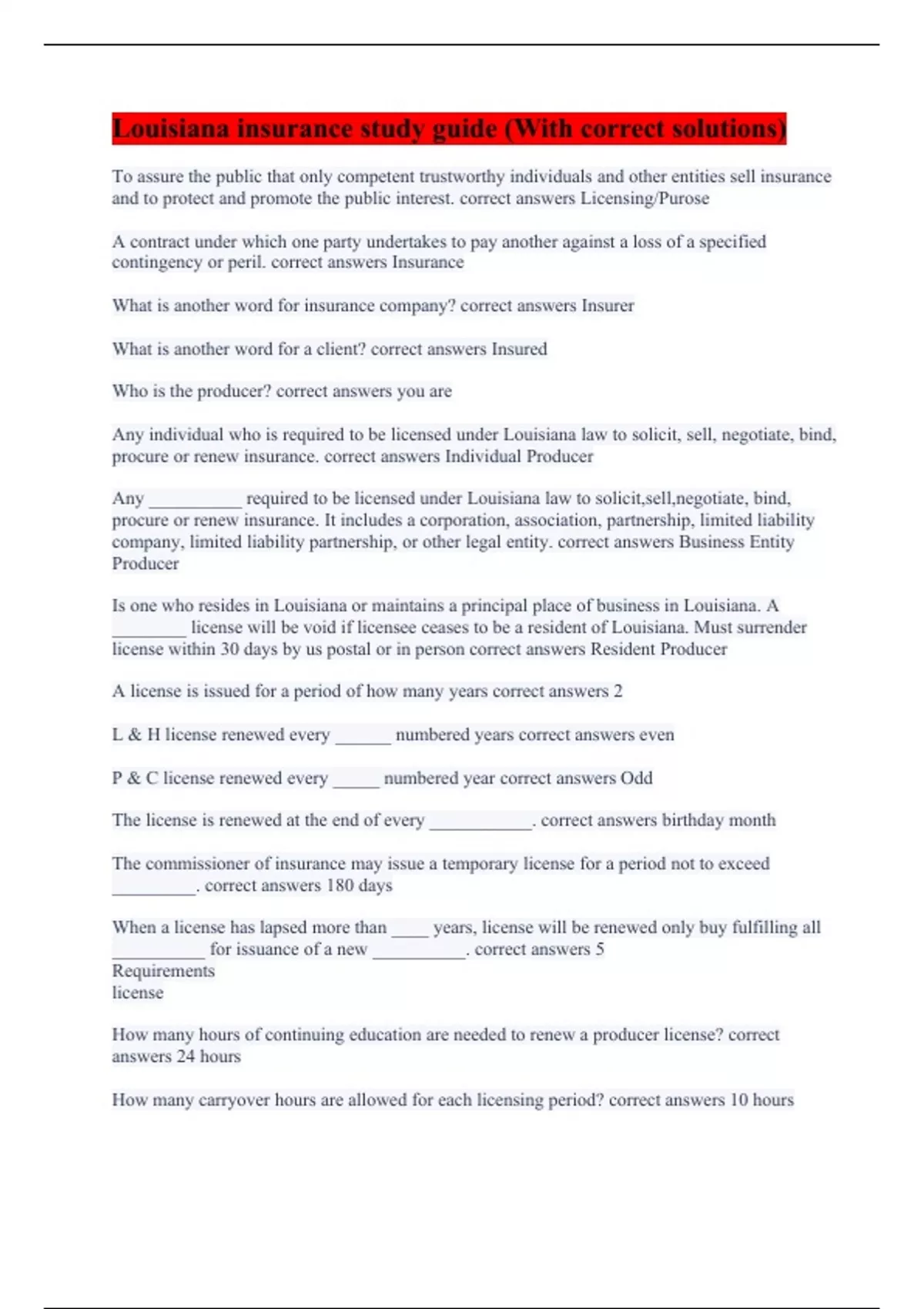 Louisiana insurance study guide (With correct solutions)