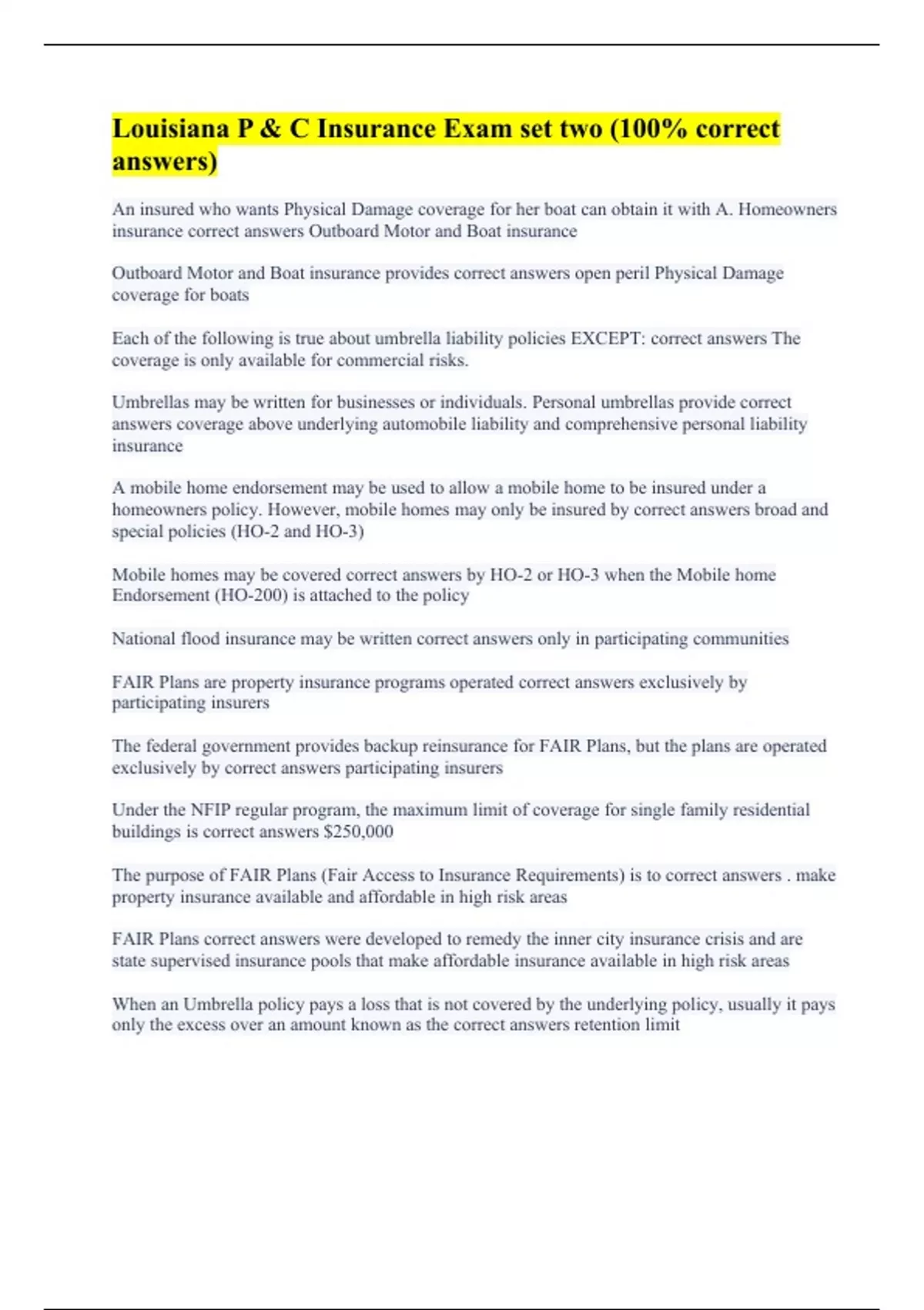 An insured who wants Physical Damage coverage for her boat can obtain it with A. Homeowners insurance correct answers Outboard Motor and Boat insurance Outboard Motor and Boat insurance provides correct answers open peril Physical Damage coverage for boats Each of the following is true about umbrella liability policies EXCEPT: correct answers The coverage is only available for commercial risks. Umbrellas may be written for businesses or individuals. Personal umbrellas provide correct answers coverage above underlying automobile liability and comprehensive personal liability insurance A mobile home endorsement may be used to allow a mobile home to be insured under a homeowners policy. However, mobile homes may only be insured by correct answers broad and special policies (HO-2 and HO-3) Mobile homes may be covered correct answers by HO-2 or HO-3 when the Mobile home Endorsement (HO-200) is attached to the policy National flood insurance may be written correct answers only in participating communities FAIR Plans are property insurance programs operated correct answers exclusively by participating insurers The federal government provides backup reinsurance for FAIR Plans, but the plans are operated exclusively by correct answers participating insurers Under the NFIP regular program, the maximum limit of coverage for single family residential buildings is correct answers $250,000 The purpose of FAIR Plans (Fair Access to Insurance Requirements) is to correct answers . make property insurance available and affordable in high risk areas FAIR Plans correct answers were developed to remedy the inner city insurance crisis and are state supervised insurance pools that make affordable insurance available in high risk areas When an Umbrella policy pays a loss that is not covered by the underlying policy, usually it pays only the excess over an amount known as the correct answers retention limit