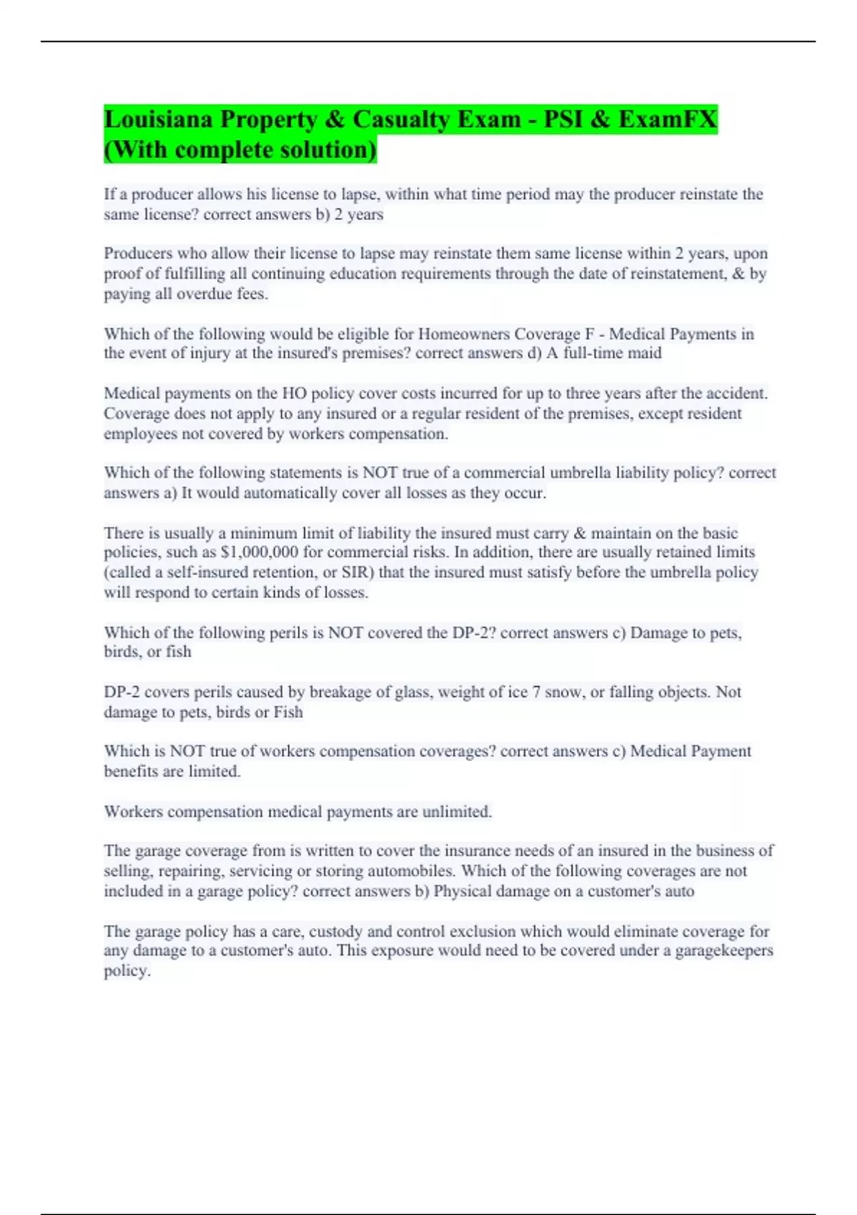 If a producer allows his license to lapse, within what time period may the producer reinstate the same license? correct answers b) 2 years Producers who allow their license to lapse may reinstate them same license within 2 years, upon proof of fulfilling all continuing education requirements through the date of reinstatement, & by paying all overdue fees. Which of the following would be eligible for Homeowners Coverage F - Medical Payments in the event of injury at the insured's premises? correct answers d) A full-time maid Medical payments on the HO policy cover costs incurred for up to three years after the accident. Coverage does not apply to any insured or a regular resident of the premises, except resident employees not covered by workers compensation. Which of the following statements is NOT true of a commercial umbrella liability policy? correct answers a) It would automatically cover all losses as they occur. There is usually a minimum limit of liability the insured must carry & maintain on the basic policies, such as $1,000,000 for commercial risks. In addition, there are usually retained limits (called a self-insured retention, or SIR) that the insured must satisfy before the umbrella policy will respond to certain kinds of losses. Which of the following perils is NOT covered the DP-2? correct answers c) Damage to pets, birds, or fish DP-2 covers perils caused by breakage of glass, weight of ice 7 snow, or falling objects. Not damage to pets, birds or Fish Which is NOT true of workers compensation coverages? correct answers c) Medical Payment benefits are limited. Workers compensation medical payments are unlimited. The garage coverage from is written to cover the insurance needs of an insured in the business of selling, repairing, servicing or storing automobiles. Which of the following coverages are not included in a garage policy? correct answers b) Physical damage on a customer's auto The garage policy has a care, custody and control exclusion which would eliminate coverage for any damage to a customer's auto. This exposure would need to be covered under a garagekeepers policy.