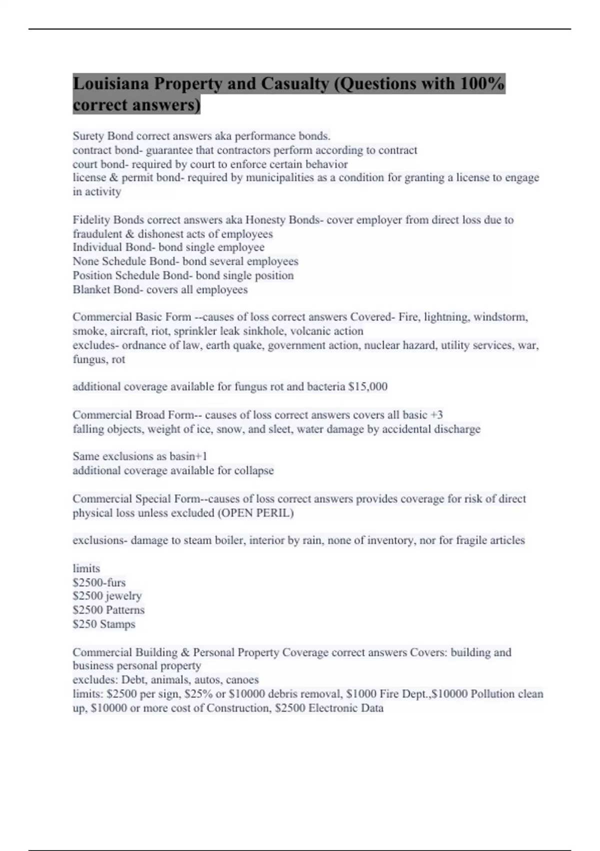 Surety Bond correct answers aka performance bonds. contract bond- guarantee that contractors perform according to contract court bond- required by court to enforce certain behavior license & permit bond- required by municipalities as a condition for granting a license to engage in activity Fidelity Bonds correct answers aka Honesty Bonds- cover employer from direct loss due to fraudulent & dishonest acts of employees Individual Bond- bond single employee None Schedule Bond- bond several employees Position Schedule Bond- bond single position Blanket Bond- covers all employees Commercial Basic Form --causes of loss correct answers Covered- Fire, lightning, windstorm, smoke, aircraft, riot, sprinkler leak sinkhole, volcanic action excludes- ordnance of law, earth quake, government action, nuclear hazard, utility services, war, fungus, rot additional coverage available for fungus rot and bacteria $15,000 Commercial Broad Form-- causes of loss correct answers covers all basic +3 falling objects, weight of ice, snow, and sleet, water damage by accidental discharge Same exclusions as basin+1 additional coverage available for collapse Commercial Special Form--causes of loss correct answers provides coverage for risk of direct physical loss unless excluded (OPEN PERIL) exclusions- damage to steam boiler, interior by rain, none of inventory, nor for fragile articles limits $2500-furs $2500 jewelry $2500 Patterns $250 Stamps Commercial Building & Personal Property Coverage correct answers Covers: building and business personal property excludes: Debt, animals, autos, canoes limits: $2500 per sign, $25% or $10000 debris removal, $1000 Fire Dept.,$10000 Pollution clean up, $10000 or more cost of Construction, $2500 Electronic Data