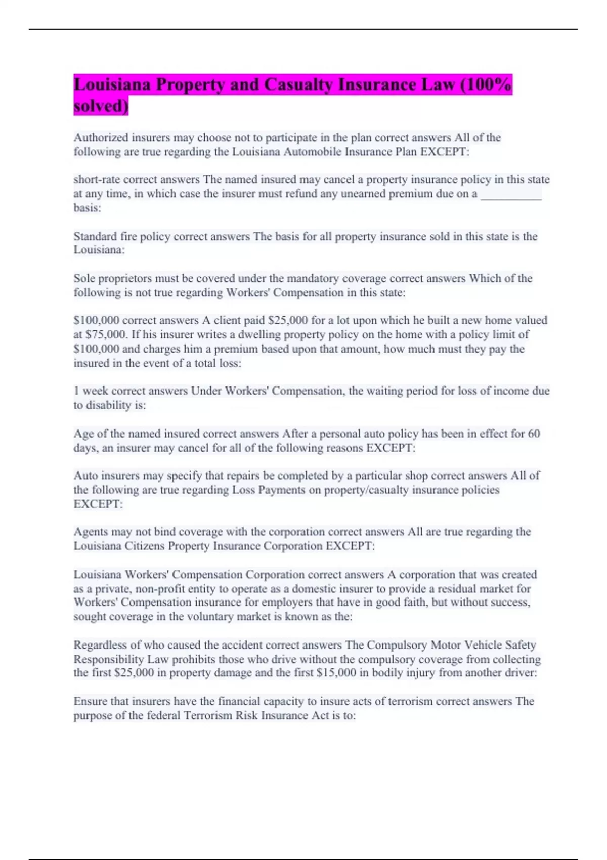 Authorized insurers may choose not to participate in the plan correct answers All of the following are true regarding the Louisiana Automobile Insurance Plan EXCEPT: short-rate correct answers The named insured may cancel a property insurance policy in this state at any time, in which case the insurer must refund any unearned premium due on a __________ basis: Standard fire policy correct answers The basis for all property insurance sold in this state is the Louisiana: Sole proprietors must be covered under the mandatory coverage correct answers Which of the following is not true regarding Workers' Compensation in this state: $100,000 correct answers A client paid $25,000 for a lot upon which he built a new home valued at $75,000. If his insurer writes a dwelling property policy on the home with a policy limit of $100,000 and charges him a premium based upon that amount, how much must they pay the insured in the event of a total loss: 1 week correct answers Under Workers' Compensation, the waiting period for loss of income due to disability is: Age of the named insured correct answers After a personal auto policy has been in effect for 60 days, an insurer may cancel for all of the following reasons EXCEPT: Auto insurers may specify that repairs be completed by a particular shop correct answers All of the following are true regarding Loss Payments on property/casualty insurance policies EXCEPT: Agents may not bind coverage with the corporation correct answers All are true regarding the Louisiana Citizens Property Insurance Corporation EXCEPT: Louisiana Workers' Compensation Corporation correct answers A corporation that was created as a private, non-profit entity to operate as a domestic insurer to provide a residual market for Workers' Compensation insurance for employers that have in good faith, but without success, sought coverage in the voluntary market is known as the: Regardless of who caused the accident correct answers The Compulsory Motor Vehicle Safety Responsibility Law prohibits those who drive without the compulsory coverage from collecting the first $25,000 in property damage and the first $15,000 in bodily injury from another driver: Ensure that insurers have the financial capacity to insure acts of terrorism correct answers The purpose of the federal Terrorism Risk Insurance Act is to: