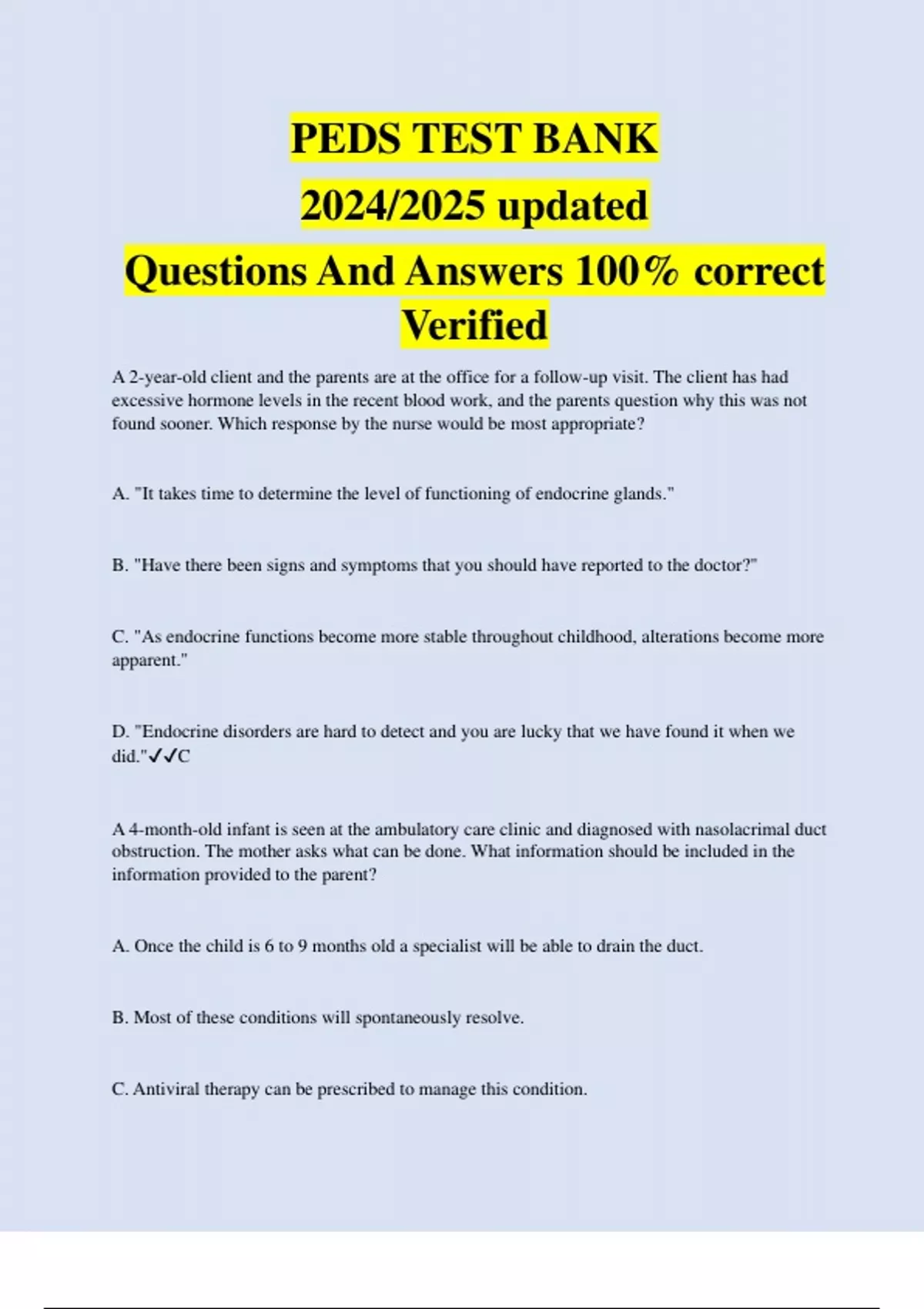 PEDS TEST BANK 2024/2025 updated Questions And Answers 100% correct Verified